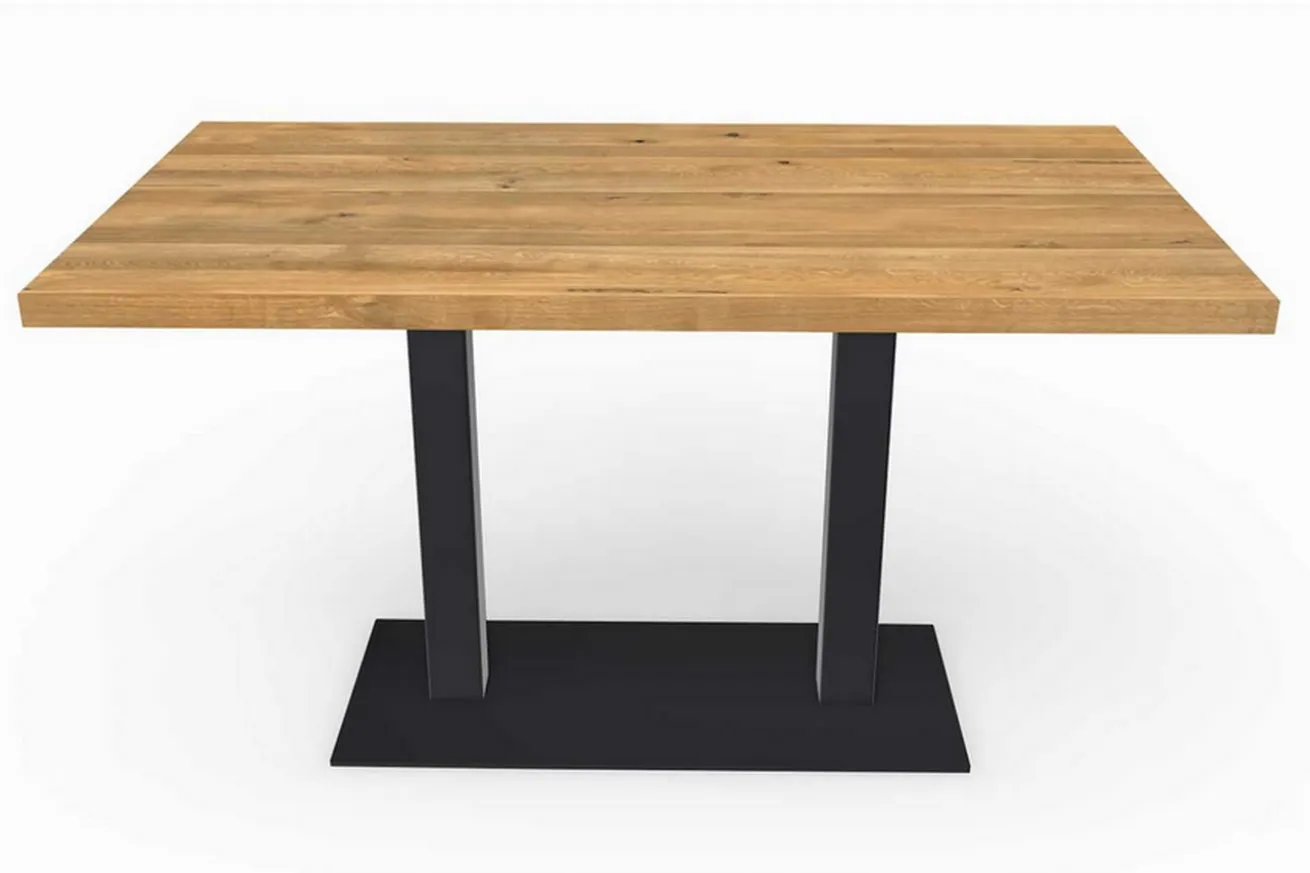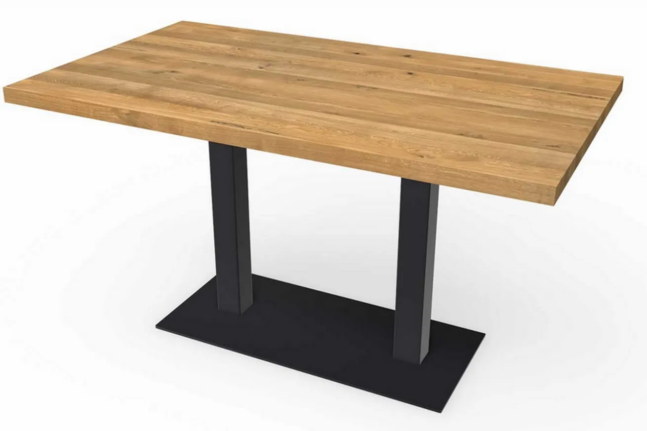 Das Produkt, das durch die Holzart rustikal erscheint, eignet sich perfekt als Esstisch in Bistros, aber auch in privaten Esszimmern. Das Eichenholz steht nicht nur im Kontrast zum schwarzen Gestell, sondern ist eine einzigartige Kombination im Loft-Stil und lässt sich perfekt mit anderen Massivholzmöbeln der gleichen Holzart zusammenstellen.