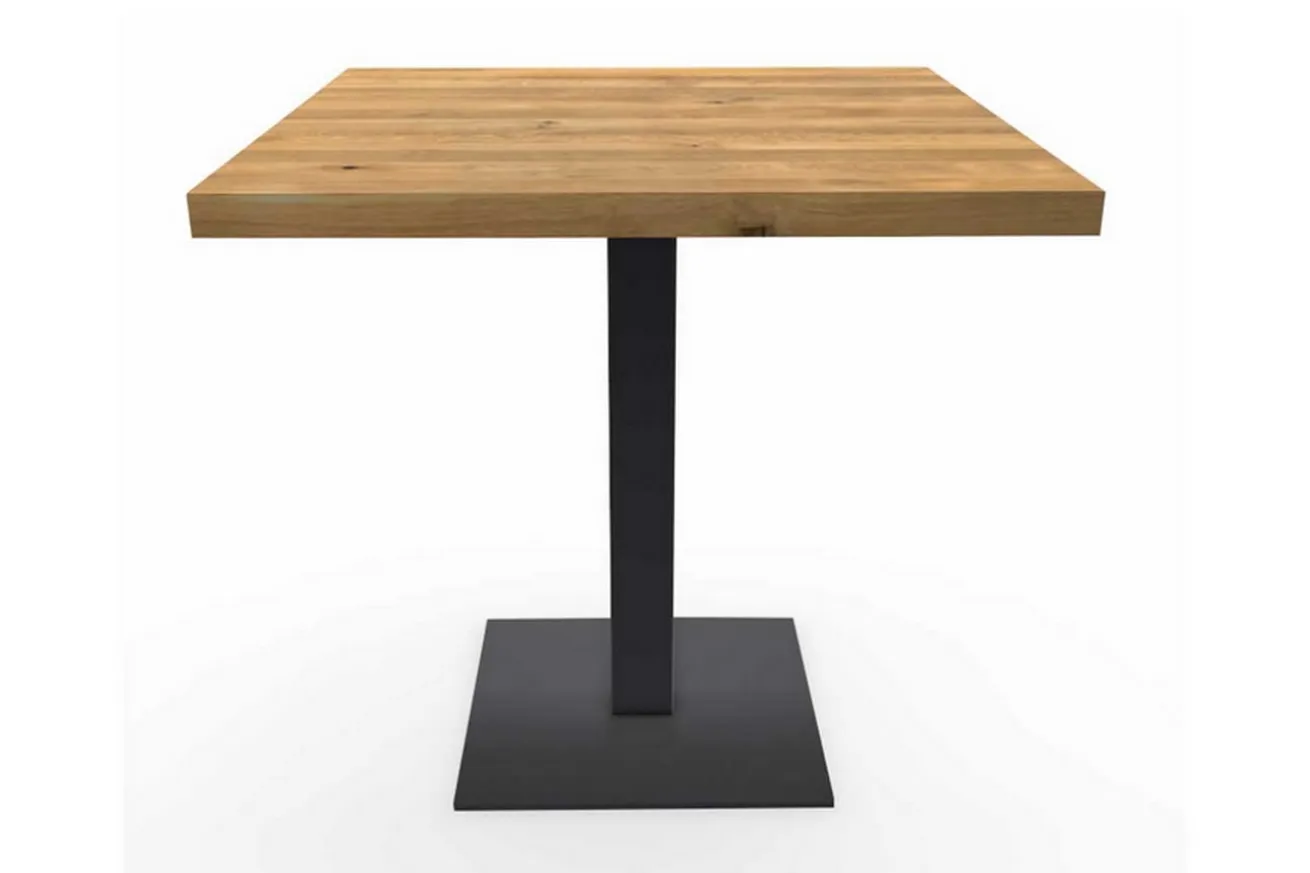 Dieser Bistrotisch ist aus massiver europäischer Eiche gefertigt und hat eine optische Plattenstärke von 4 cm. Die Oberfläche ist geschliffen. Die Äste und Risse sind offen und nicht manuell behandelt sondern im natürlichen Rohzustand. Die gesamte Oberfläche ist noch unbehandelt. Durch die unbehandelte Oberfläche können Sie eine Oberflächenversieglung oder Farbe je nach Geschmack selber auftragen. Üblicherweise wird die Holzgüteklasse B für den Plattenbau verwendet. Die Planken sind zwischen 8-18cm breit. Somit erhalten Sie einen einen quadratischen Bistrotisch mit einer Breite und Tiefe von je 50cm. Die unbehandelte Eicheplatte wird von einem schwarz pulverbeschichteten Stahlgestell getragen und verleiht dem Möbelstück somit eine Höhe von 76 cm.
