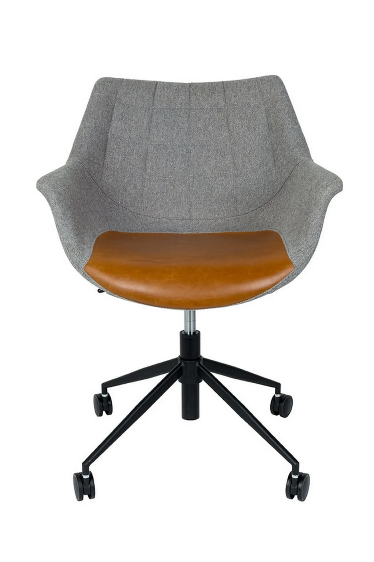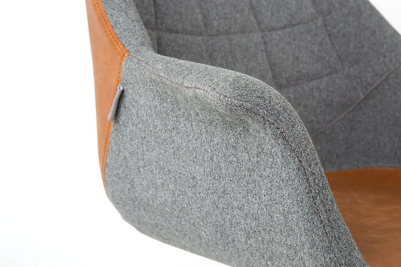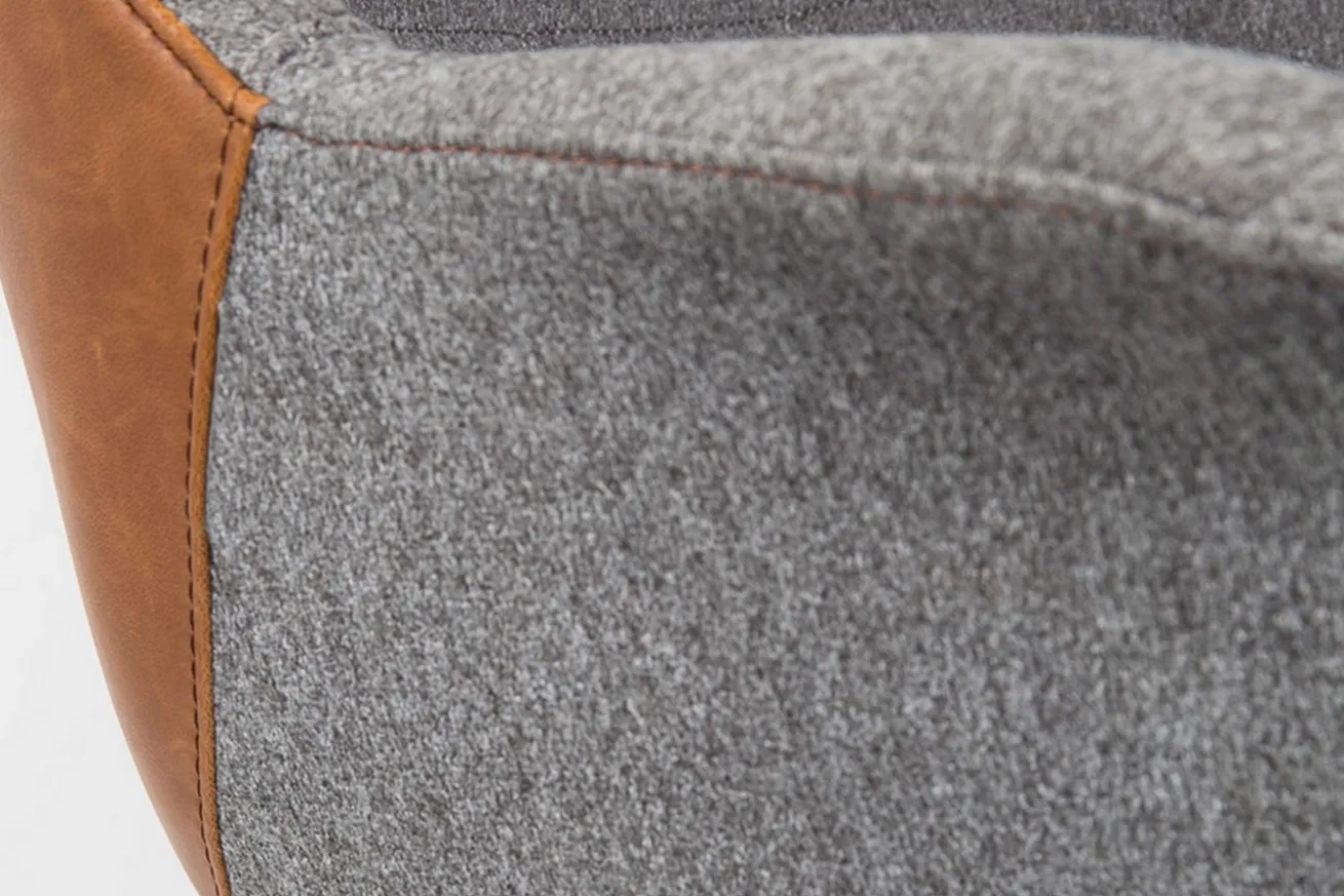 Also irgendwie erinnert uns der Stuhl ans Büro. Schade nur, dass sie nicht so schön aussahen wie unser Modell. Doulon ist nämlich ein Vorzeigearbeiter und hat sehr viele, positive Eigenschaften. Aber wurschteln wir uns doch einfach von oben nach unten durch und beginnen mit den Grundlegenden Eckdaten. Diese wäre die Höhe von 91cm, die Breite von 67cm und die Tiefe von 63cm. Die Sitzschale wurde aus Sperrholz zusammengetragen und geformt, und mit zwei verschiedenen Stoffen ummantelt. Einmal ist es die braune Sitzfläche und Lehne, die zu 70% aus Fettleder besteht, einem weichen Leder und 30% aus Polyester in grau, das sehr langlebig ist. Damit aber noch nicht genug: Um für die Moderne, die wir alle lieben, zu sorgen, hält ein schwarz pulverbeschichteter Drehfuß den Korpus. Also ein wahrer Büroheld. Jene Zusammensetzung strahlt ein unverwechselbares Flair aus.