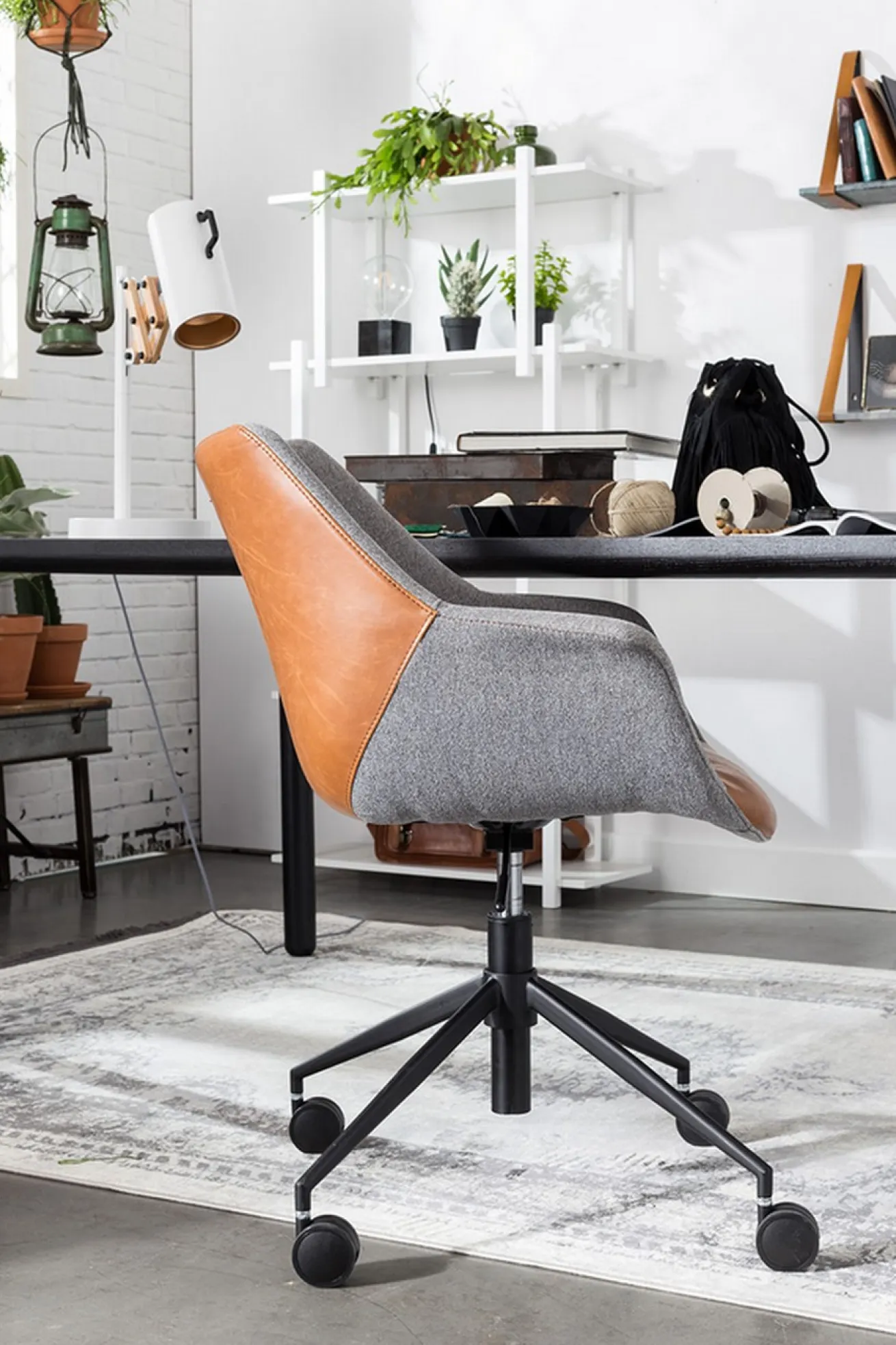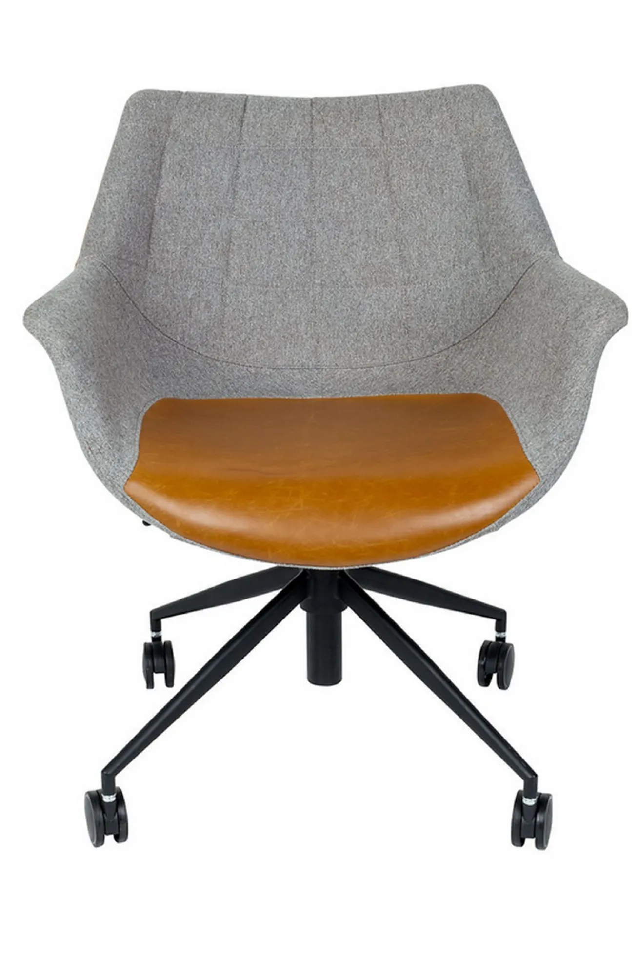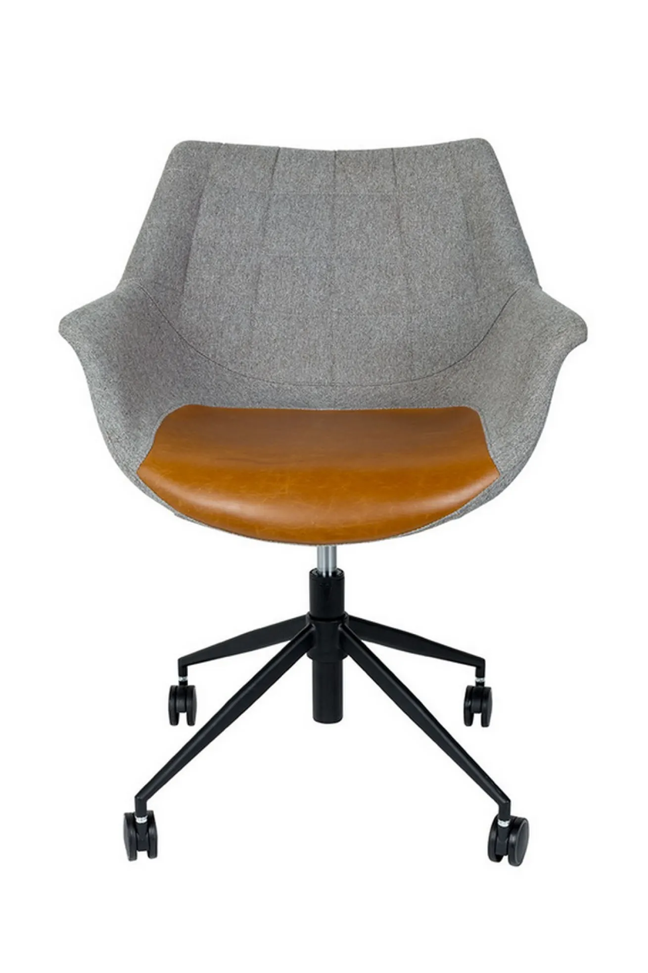Also irgendwie erinnert uns der Stuhl ans Büro. Schade nur, dass sie nicht so schön aussahen wie unser Modell. Doulon ist nämlich ein Vorzeigearbeiter und hat sehr viele, positive Eigenschaften. Aber wurschteln wir uns doch einfach von oben nach unten durch und beginnen mit den Grundlegenden Eckdaten. Diese wäre die Höhe von 91cm, die Breite von 67cm und die Tiefe von 63cm. Die Sitzschale wurde aus Sperrholz zusammengetragen und geformt, und mit zwei verschiedenen Stoffen ummantelt. Einmal ist es die braune Sitzfläche und Lehne, die zu 70% aus Fettleder besteht, einem weichen Leder und 30% aus Polyester in grau, das sehr langlebig ist. Damit aber noch nicht genug: Um für die Moderne, die wir alle lieben, zu sorgen, hält ein schwarz pulverbeschichteter Drehfuß den Korpus. Also ein wahrer Büroheld. Jene Zusammensetzung strahlt ein unverwechselbares Flair aus.