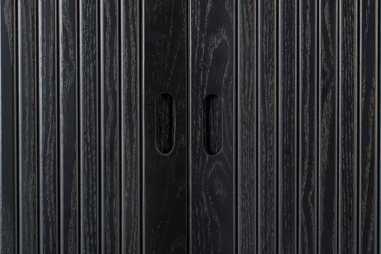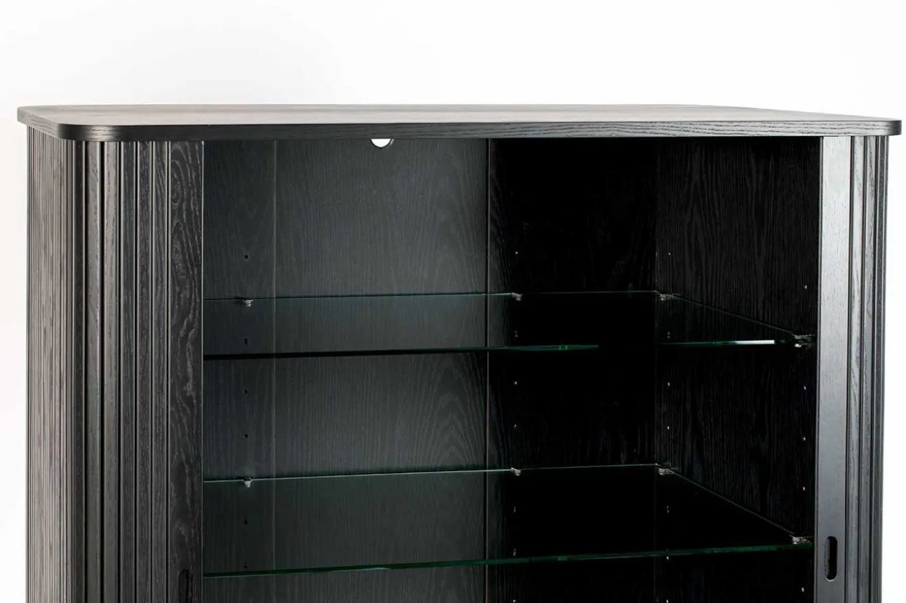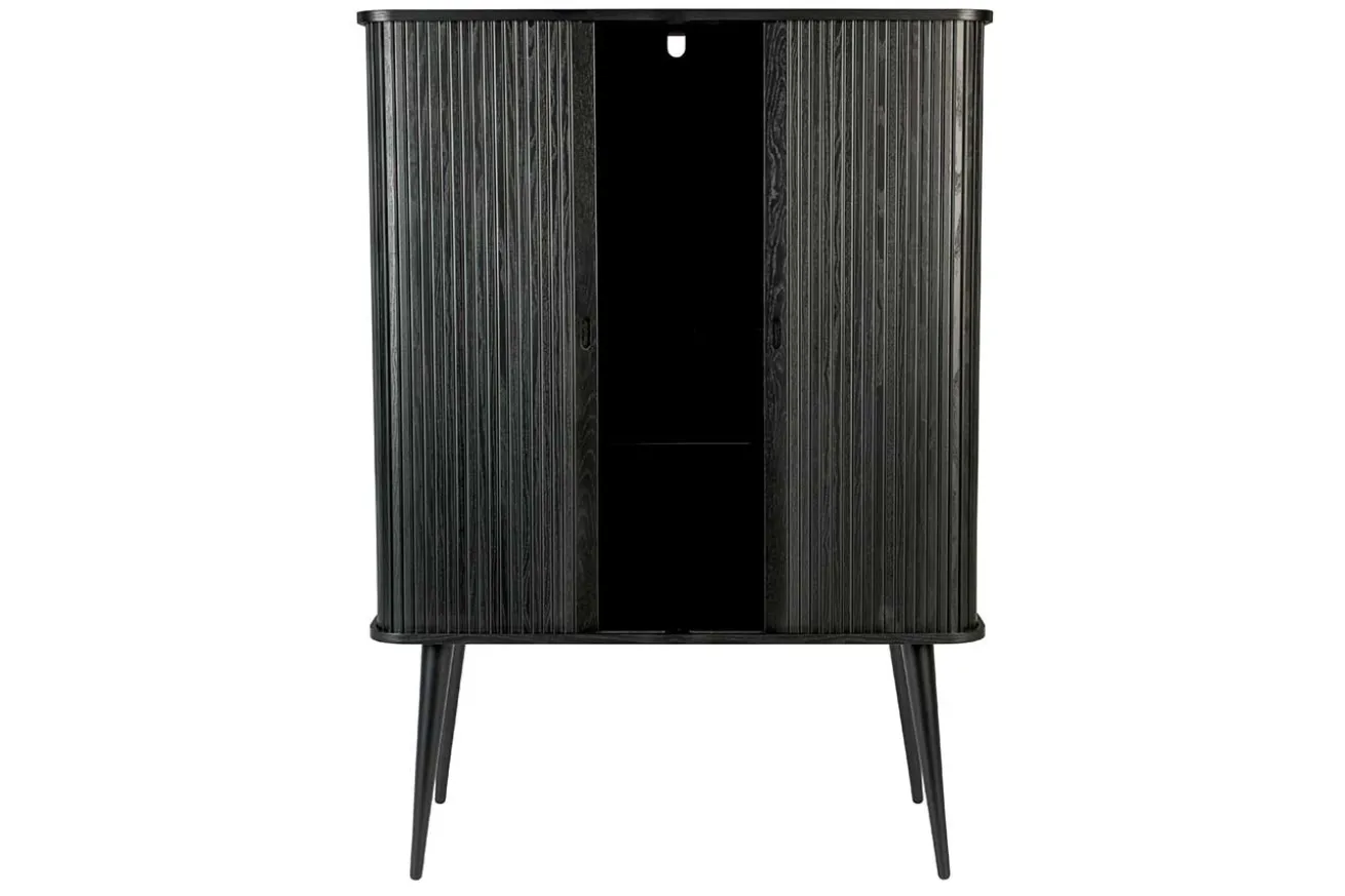 Das Buffet im Retro Stil ist aus Esche Holz gefertigt. Es hat eine Höhe von 140cm, eine Breite von 100cm und eine Tiefe von 45cm. Barbara steht auf vier unten schmaler werdenden, runden Füßen. Die praktischen Schiebetüren, welche im Korpus verschwinden, machen den Schrank ideal für kleine Wohnungen oder Zimmer. Die hochwertige Verarbeitung wird ducrh die transparenten Einlegeböden komplettiert. Das Küchenbuffet, das schwarz lackiert wurde, überzeugt durch seine schöne Optik. Ein robuster Küchenschrank aus Eschenholz, für den jeder Begeisterung empfindet. Für alle Liebhaber des angesagten Retro Looks ein absolutes Einrichtungs Muss!