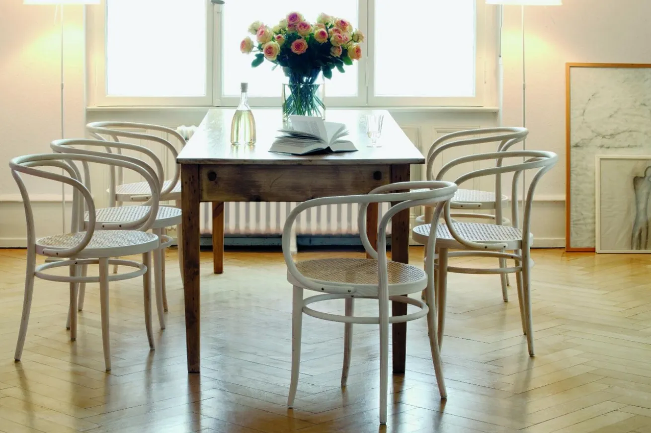 Dieses elegante Meisterwerk aus Bugholz verkörpert höchste Kunstfertigkeit in Konstruktion und Herstellung. Der großzügige Bogen, der Rücken- und Armlehne in einem harmonischen Schwung vereint, wird aus einem einzigen Stück massiven Buchenholzes geformt. Wie das legendäre Original, Modell Nr. 214, besteht auch der Stuhl Nr. 209 lediglich aus sechs Teilen. Durch seine ästhetische Simplizität und organische Formgebung erweckt er den Eindruck einer Skulptur. Sein zeitloses Design beeindruckte sogar den renommierten Schweizer Architekten Le Corbusier, der ihn in zahlreichen seiner Bauwerke, darunter die Weißenhof-Siedlung in Stuttgart im Jahr 1927, einsetzte. Er würdigte diesen Stuhl als „Adel besitzend“.