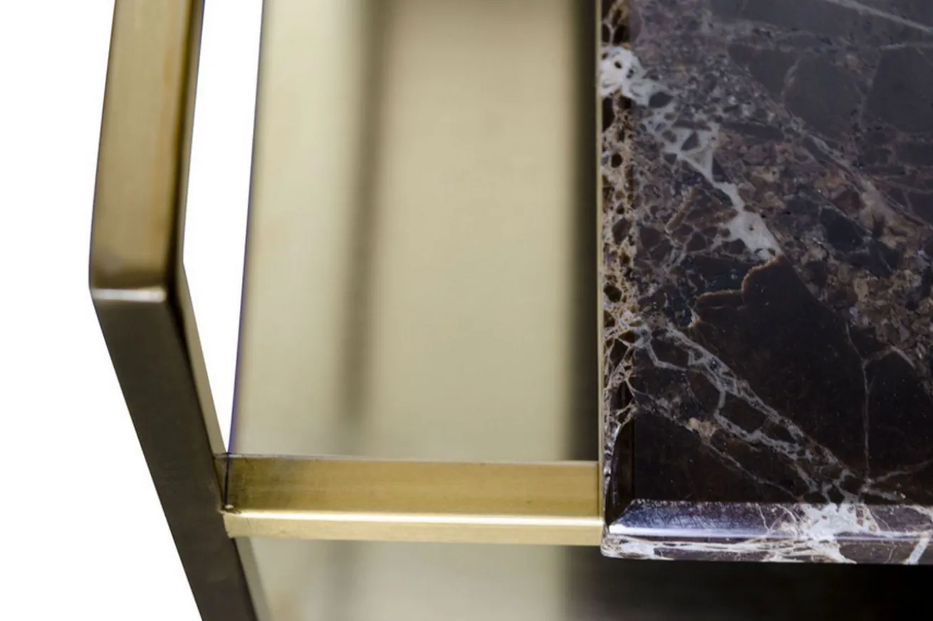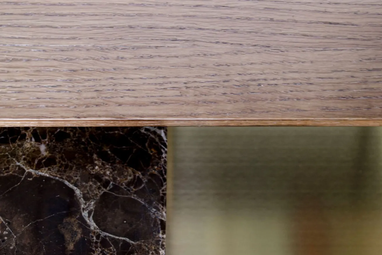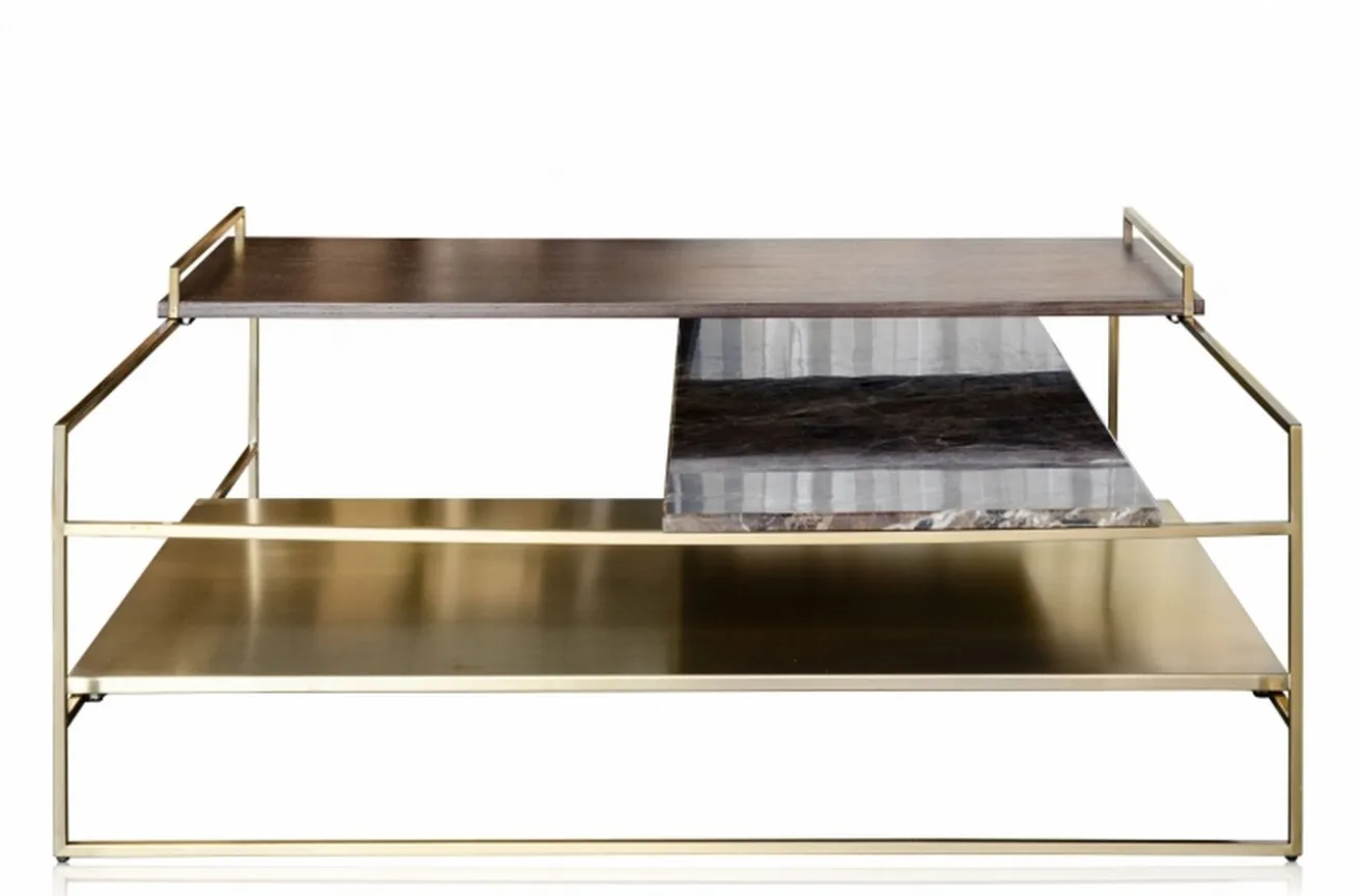 Dieser Couchtisch ist ein stilvolles Möbelstück aus Stahl mit Eichenholz und Marmor. Diese klare Linienführung steht im Kontrast zu den Platten, die verschiedene Maserungen aufweisen, dennoch ein echter Hingucker. Mit den Maßen Breite und Tiefe 100cm sowie Höhe 39,5cm eignet sich dieses Möbelstück perfekt in edle und moderne Wohnzimmer zu dunklen Couches, aber auch in simpel eingerichtete Milieus in schwarz-weiß, wo er sicher zum Hingucker des Raumes wird. Durch das relativ dünne Gestell, welches Gold gebürstet ist, sehen die Platten aus, als würden sie schweben.
