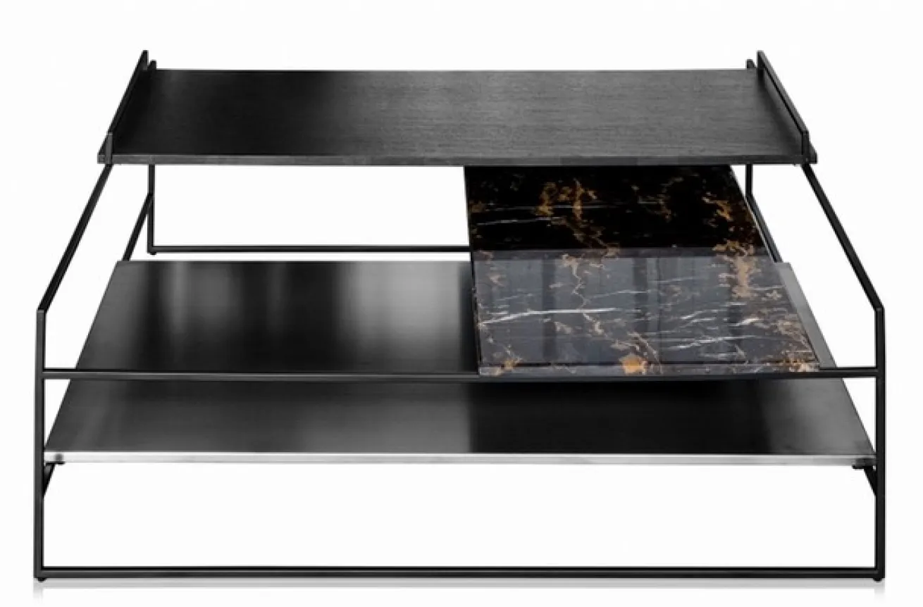 Dieser Wohnzimmertisch ist ein stilvolles Möbelstück aus Stahl mit Eichenholz und Marmor. Diese klare Linienführung steht im Kontrast zu den Platten, die verschiedene Maserungen aufweisen, dennoch ein echter Hingucker. Durch das relativ dünne Gestell, welches schwarz pulverbeschichtet ist, sehen die Platten aus, als würden sie schweben.