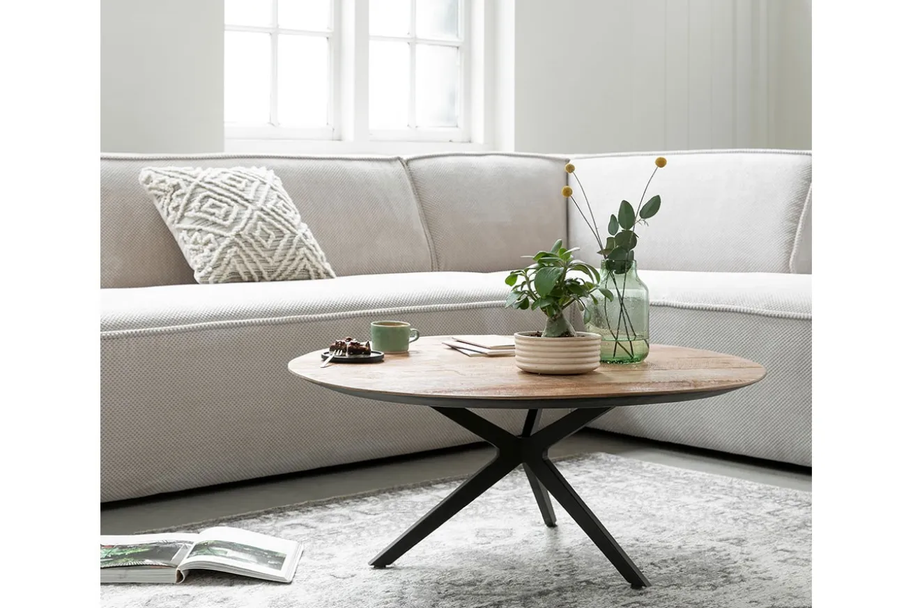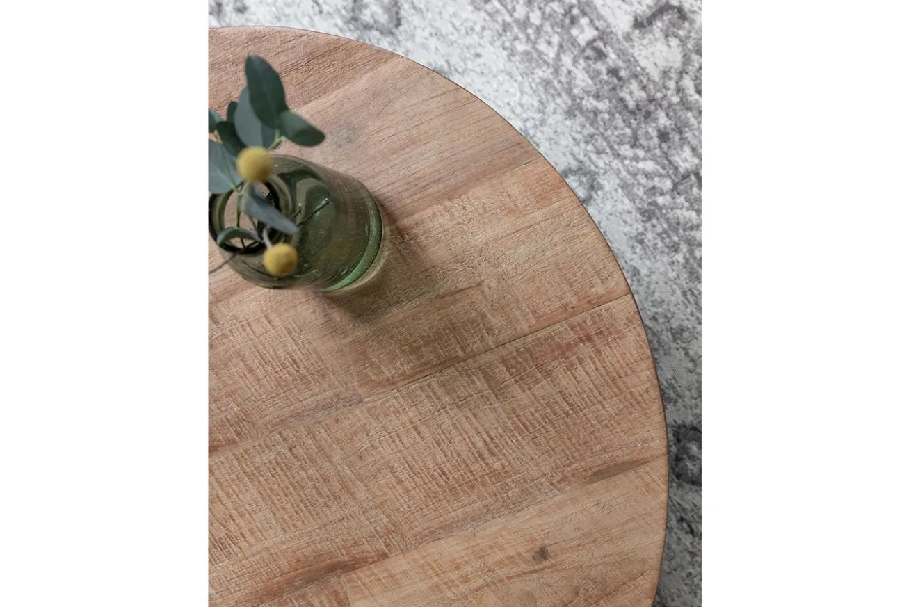 Willkommen in der Welt zeitloser Eleganz mit unserem runden Couchtisch, der nicht nur als funktionales Möbelstück dient, sondern auch als beeindruckendes Kunstwerk in Ihrem Wohnraum. Dieser Tisch vereint meisterhaft eine Platte aus recyceltem, unbehandeltem Teakholz mit einem schlanken schwarzen Metallgestell, um ein Statement der Naturschönheit und modernen Raffinesse zu setzen.
