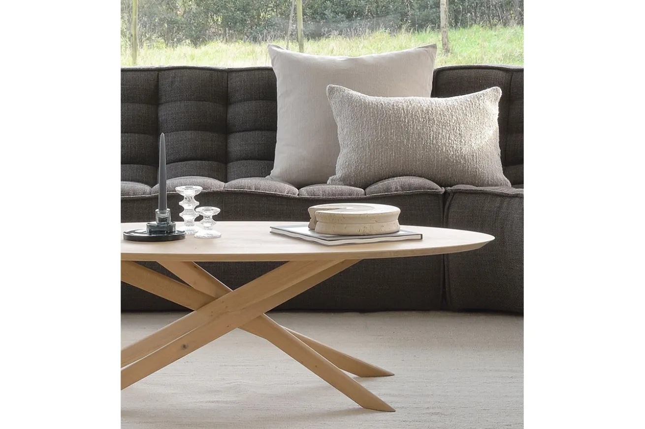 Stilvoll angefertigt bildet der Couchtisch einen eleganten Kontrast zum eingerichteten Wohnraum. Mit einer Breite von 143cm, einer Tiefe von 67cm und einer Höhe von 42cm ist dieser aus sehr hartem und widerstandsfähigem Holz produzierte Tisch ein wahrer Hingucker, da er aus genau einem Material besteht und somit die Natürlichkeit des Eichenholzes unterstrichen wird. Die Platte besteht aus einzelnen Bohlen, die aneinandergepresst und geformt die runde Platte ergeben, welche die gleichmäßige Maserung in ihren unterschiedlichen Formen, wie es für die Holzart typisch ist, hervorhebt. So erhalten Sie ein Massivholzmöbel im modernen Landhausstil. Es lässt sich perfekt mit dekorativen Büchern oder schönen Porzellanvasen herrichten.