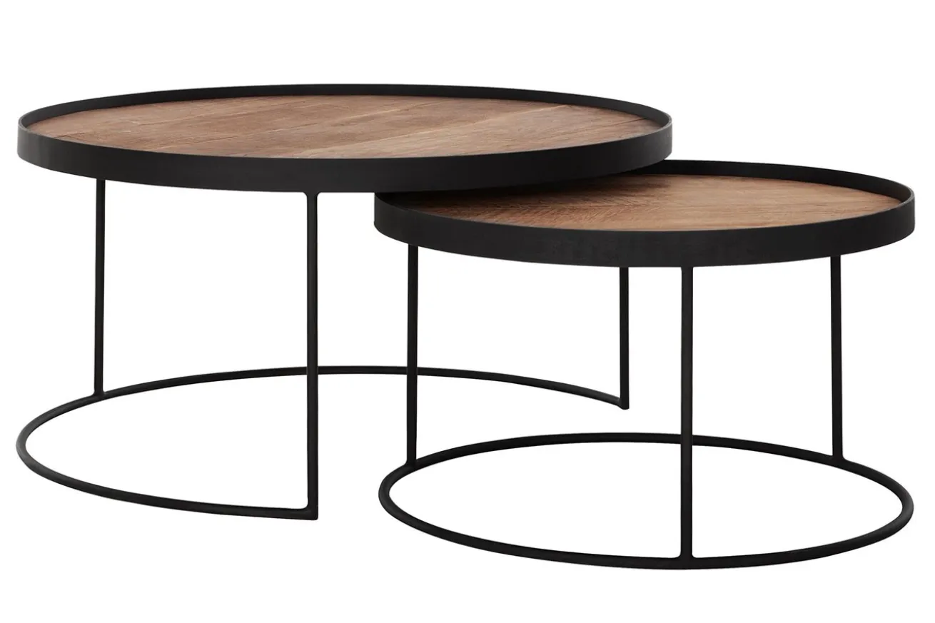Das 2er Set bietet unterschiedliche Größen, die eine vielseitige Anordnung und Nutzungsmöglichkeiten schaffen. Die schwarzen Metallgestelle sind nicht nur solide Stützen, sondern auch ein Statement moderner Ästhetik. Sie bilden einen spannenden Kontrast zur Teakholzplatte und verleihen den Tischen einen zeitgenössischen Charakter.