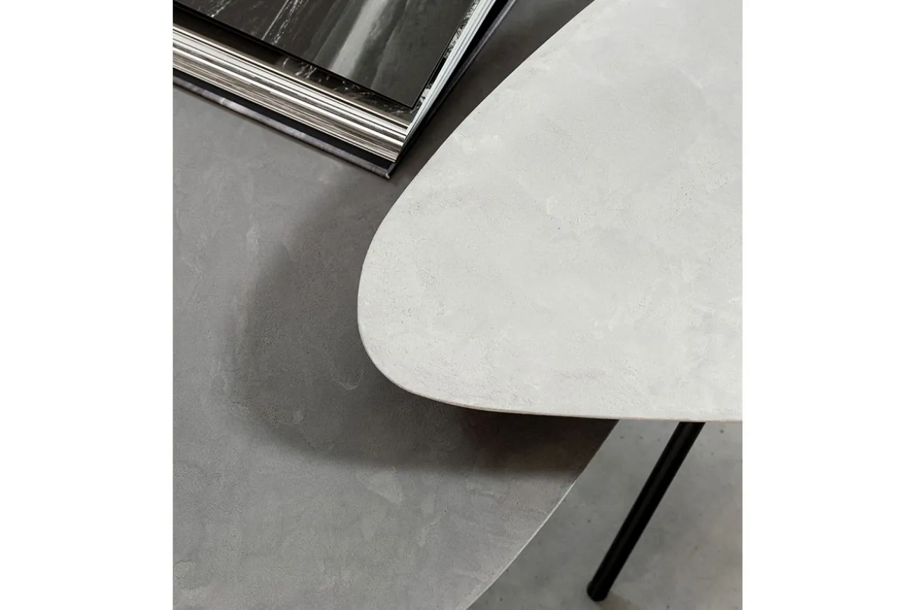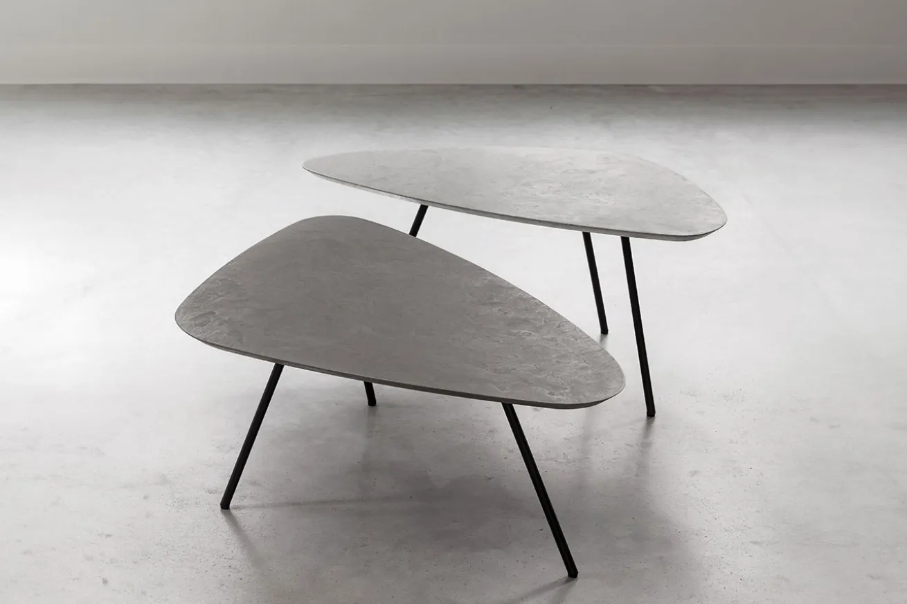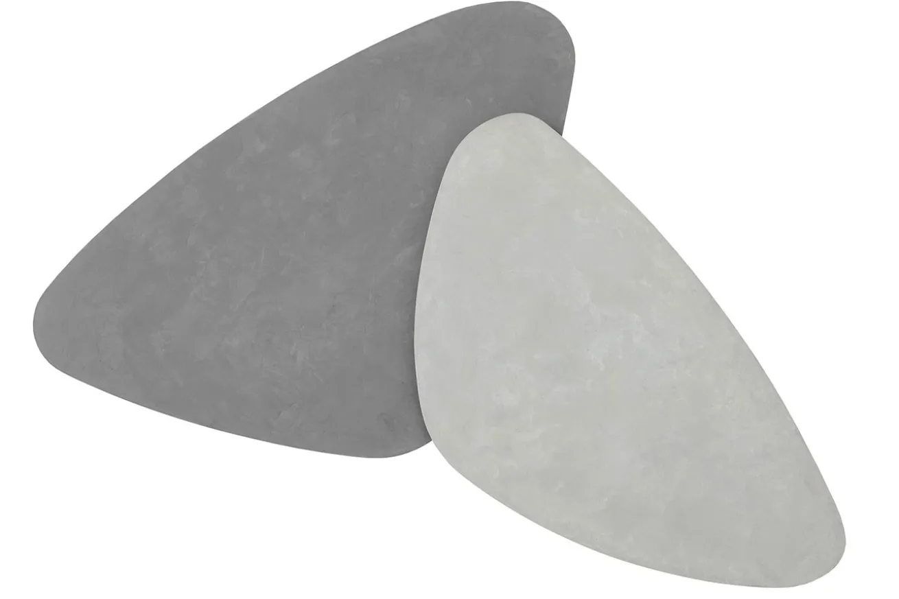 Die Tischplatten des Sets bestehen aus hochwertigem Mortex in verschiedenen Grautönen, die ein subtil vielseitiges und dennoch ansprechendes Farbschema bieten. Jede Tischplatte ist ein Unikat und verleiht Ihrem Raum eine individuelle Note. Die sanften Nuancen des Mortex sorgen für eine ruhige und harmonische Atmosphäre, während die natürliche Textur des Materials eine angenehme Haptik bietet.