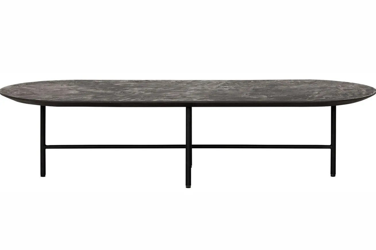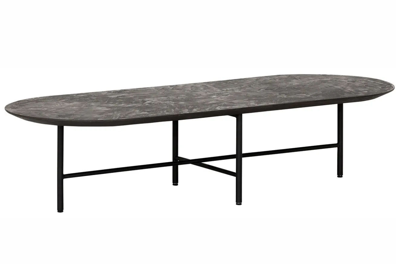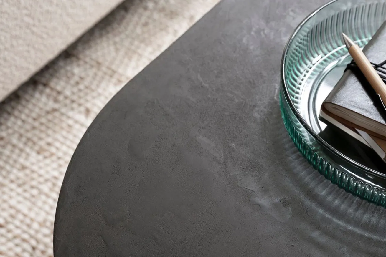 Bringen Sie mit unserem ovalen Couchtisch im Industrial-Stil aus schwarzem Mortex und Metallgestell zeitlose Eleganz und modernes Design in Ihr Zuhause und schaffen Sie einen Wohnbereich, der zum Verweilen und Entspannen einlädt.