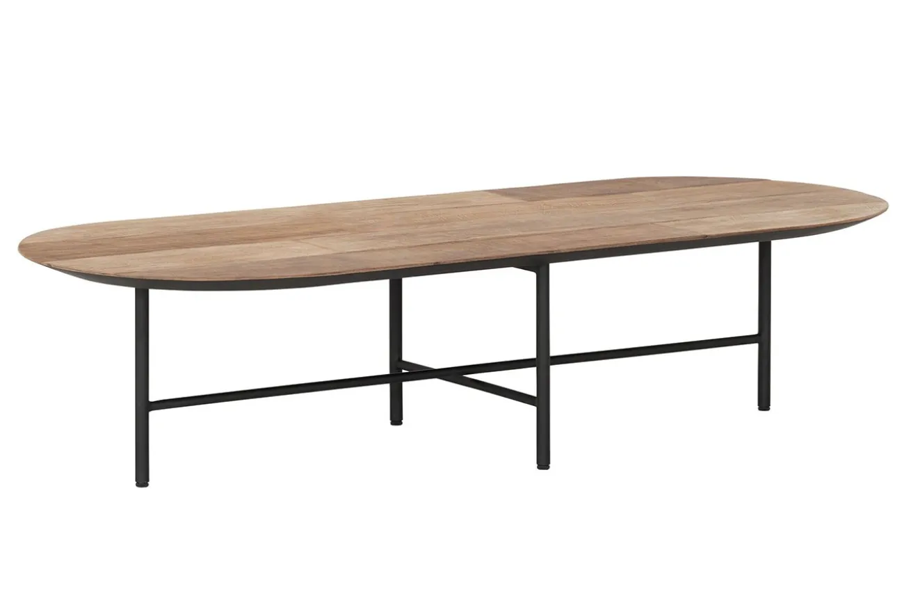 Bringen Sie mit unserem ovalen Couchtisch im Industrial-Stil aus recyceltem Teakholz und schwarzem Metallgestell zeitlose Eleganz und modernen Chic in Ihr Zuhause und schaffen Sie einen Wohnbereich, der zum Verweilen und Entspannen einlädt.