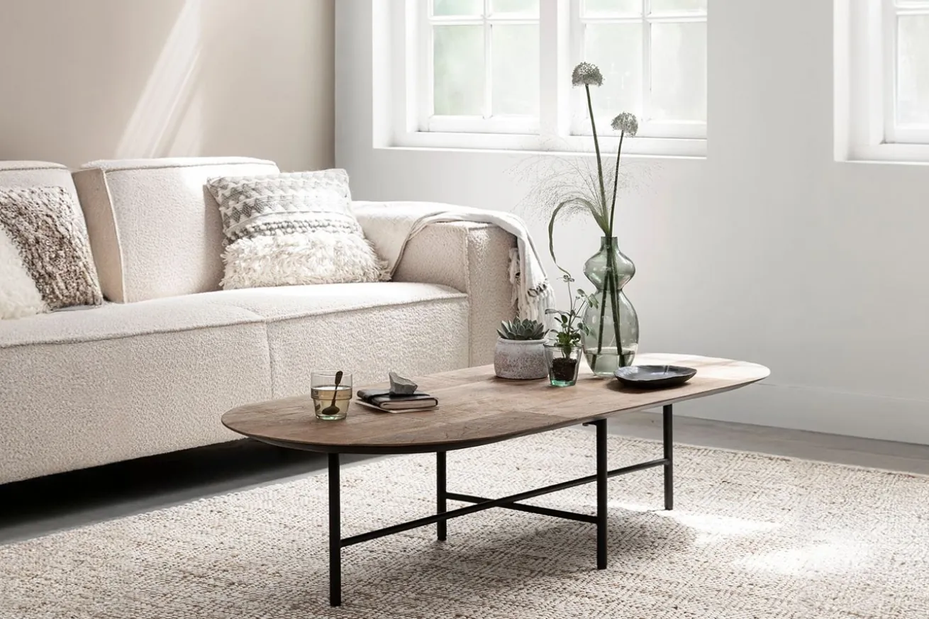 Entdecken Sie die perfekte Kombination aus rustikalem Charme und industrieller Eleganz mit unserem ovalen Couchtisch im Industrial-Stil. Die Tischplatte dieses außergewöhnlichen Möbelstücks besteht aus recyceltem Teakholz in Naturfarbe, das jedem Raum eine warme und natürliche Atmosphäre verleiht. Jedes Stück Holz erzählt seine eigene Geschichte und macht diesen Tisch zu einem einzigartigen Blickfang.