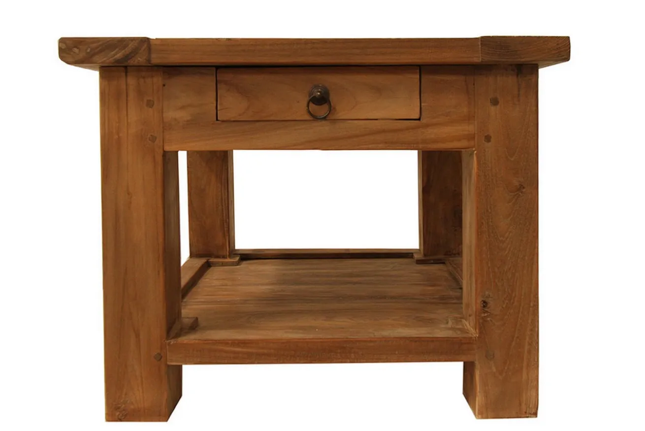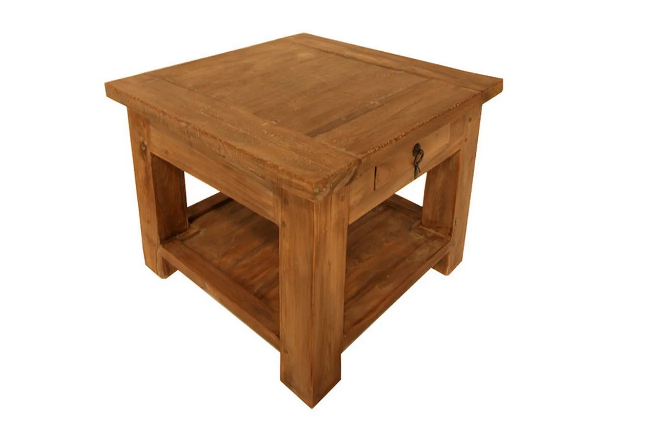 „Hach, was würde ich jetzt für einen Tisch aus recyceltem Holz in dunkler Optik geben?“, haben Sie sich schon das ein oder das andere Mal gefragt? Na dann haben wir hier die perfekte Lösung für Sie! Unsere „Elba“ hätte nämlich auch gern ein neues Zuhause. Unser Produkt, dessen Holz aus dem Teakbaum entstammt, wurde schon früher im Hausbau verwendet. Deshalb haben wir einen Tisch daraus gemacht. Dieser Wohnzimmertisch ist aus recyceltem Teakholz und hat die quadratischen Maße Breite und Tiefe je 60cm sowie eine Höhe von 45cm. Das Produkt aus recyceltem Material lässt sich mit einem feuchten Tuch oder Staubwedel reinigen. Achja, er hat auch eine Schublade mit schwarzem Ringgriff, damit Sie ihre Habseligkeiten oder die Fernbedienung vor anderen Menschen dort verstecken können. Das rustikal aussehende Möbelstück hat nicht nur genug Fläche für Dekoration, sondern passt auch in verschiedene Milieus, sei es Landhaus, modern oder rustikal.