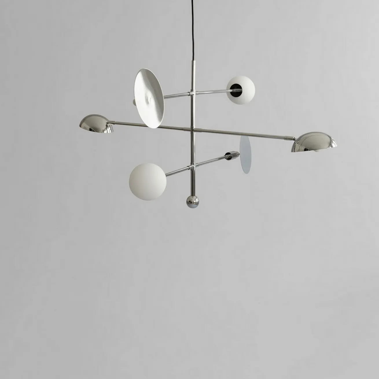 Der Sahn Chandelier von 101 Copenhagen übersetzt die experimentelle Formensprache der 1970er-Jahre in ein zeitgemäßes Lichtobjekt. Das Design orientiert sich an space-age-inspirierten Strukturen und setzt auf eine offene, grafische Konstruktion, die dem Raum sofort visuelle Spannung verleiht. Die Variante in Chrom – wie auf dem Bild – bringt eine hochglänzende, moderne Präsenz mit klarer technischer Präzision.