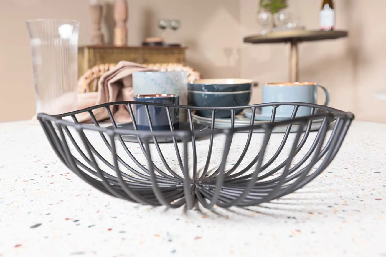 Zur reinen Deko ist dieser Korb viel zu schade: Verwenden Sie ihn doch einfach für Obst, Gemüse oder als Brotkorb. Damit werten Sie jeden schlicht gedeckten Frühstückstisch stilvoll auf. Ungerade und doch irgendwie perfeke Linienführungen bilden diesen schwarzen Dekokorb in schwarz. Er hat einen Durchmesser von 20cm sowie eine Höhe von 6cm.