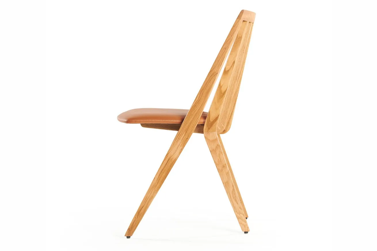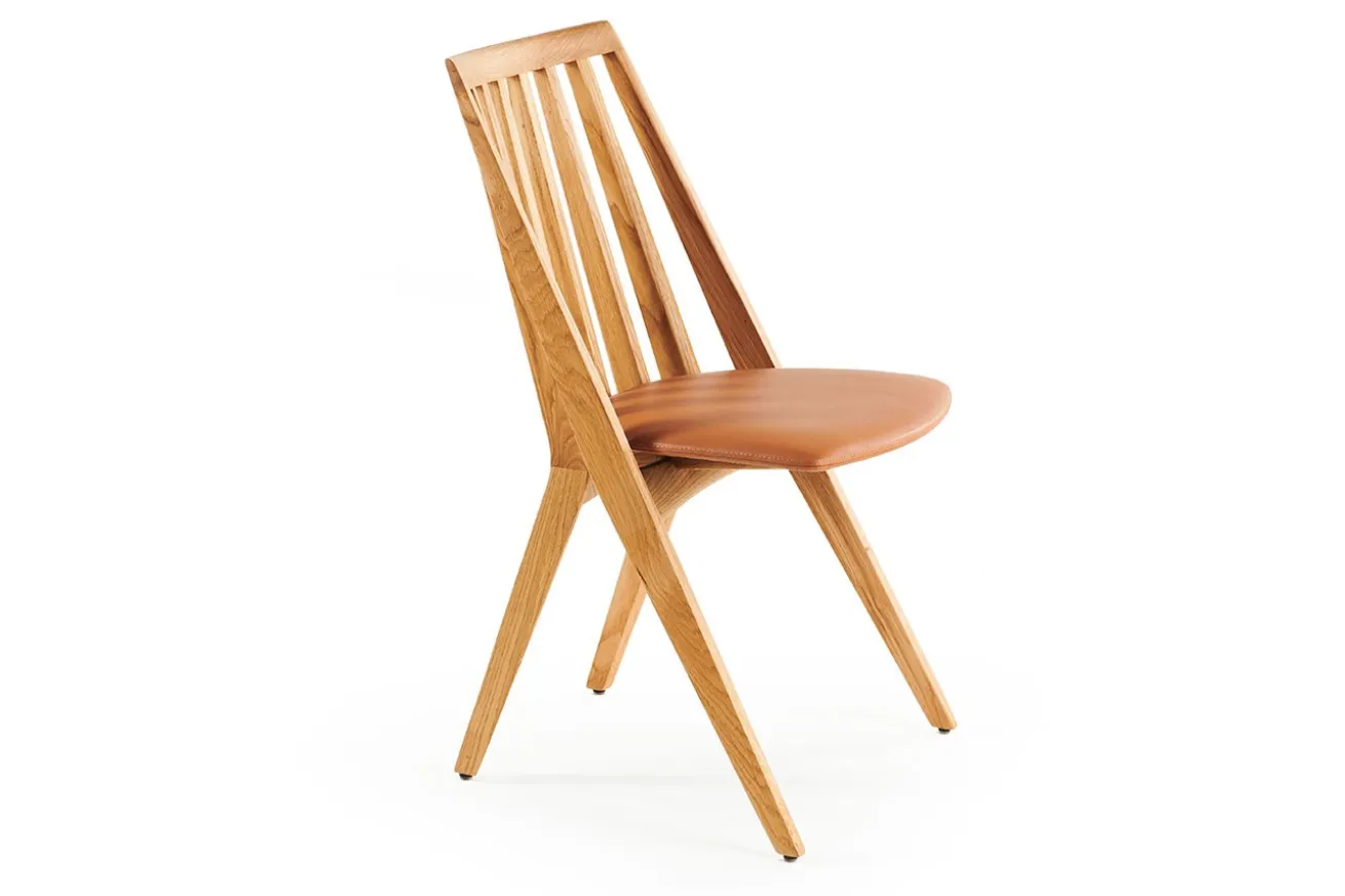 Die dezent gepolsterte Sitzfläche, bezogen mit hochwertigem Echtleder in einem warmen Cognacton, bietet zusätzlichen Komfort – ideal für lange Abende am Esstisch. Die handwerklich präzise Verarbeitung unterstreicht die Langlebigkeit und Wertigkeit des Möbels.