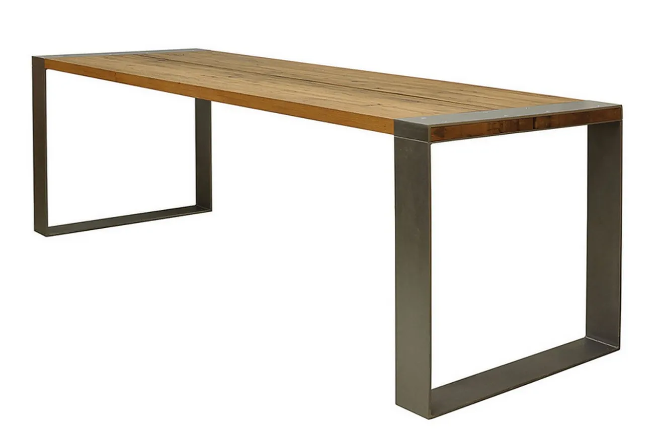 Dieser Designtisch besteht aus Holz einer Alteiche und einem Metallgestell, das die Platte nicht nur trägt, sondern sie auch umschließt. Er hat eine Breite von 220cm, eine Tiefe von 100cm und eine Höhe von 76cm ist also somit alles andere als kurz, sondern gleicht eher einer Speisetafel. Daher passt das Massivholzmöbel eher in große Esszimmer und andere Räumlichkeiten mit genug Platz für Stühle und Sideboards. Das Produkt besteht aus einer Holzplatte, die aus einzelnen Planken zusammengesetzt ist und geölt wurde. Auch das Metallgestell, das pulverbeschichtet ist, wurde geölt. So erhält der Esszimmertisch einen rustikalen Stil.