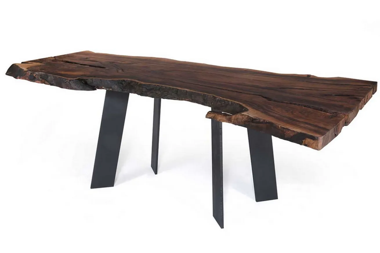 Die Tafel hat die Maße Breite 213cm, Länge 66-100cm und Höhe 79cm (samt Beinen) und dient dank ihrer organischen Kante samt schwarzen Beinen aus Metall, die vier an der Zahl sind, einfach als Hingucker. Vor allem dank der geölten Oberfläche, deren ursprüngliche Maserung und Farbe erhalten bleibt, kann so ein Esstisch in sehr modernen, aber auch rustikal gehaltenen Milieus nur wunderbar aussehen. Wie wäre es mit den passenden Stühlen aus Leder und einer Lampe im Loftstil, bei der eigentlich die Glühbirnen der Hingucker sind? Dekorieren und richten Sie den neuen Tisch für Ihr Esszimmer nach Ihren Wünschen ein, dieser europäische Nussbaumtisch lässt alles mit sich machen.