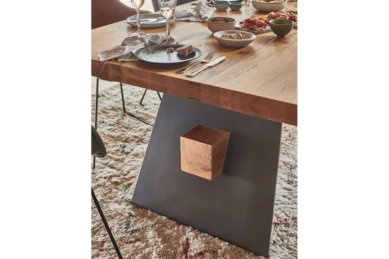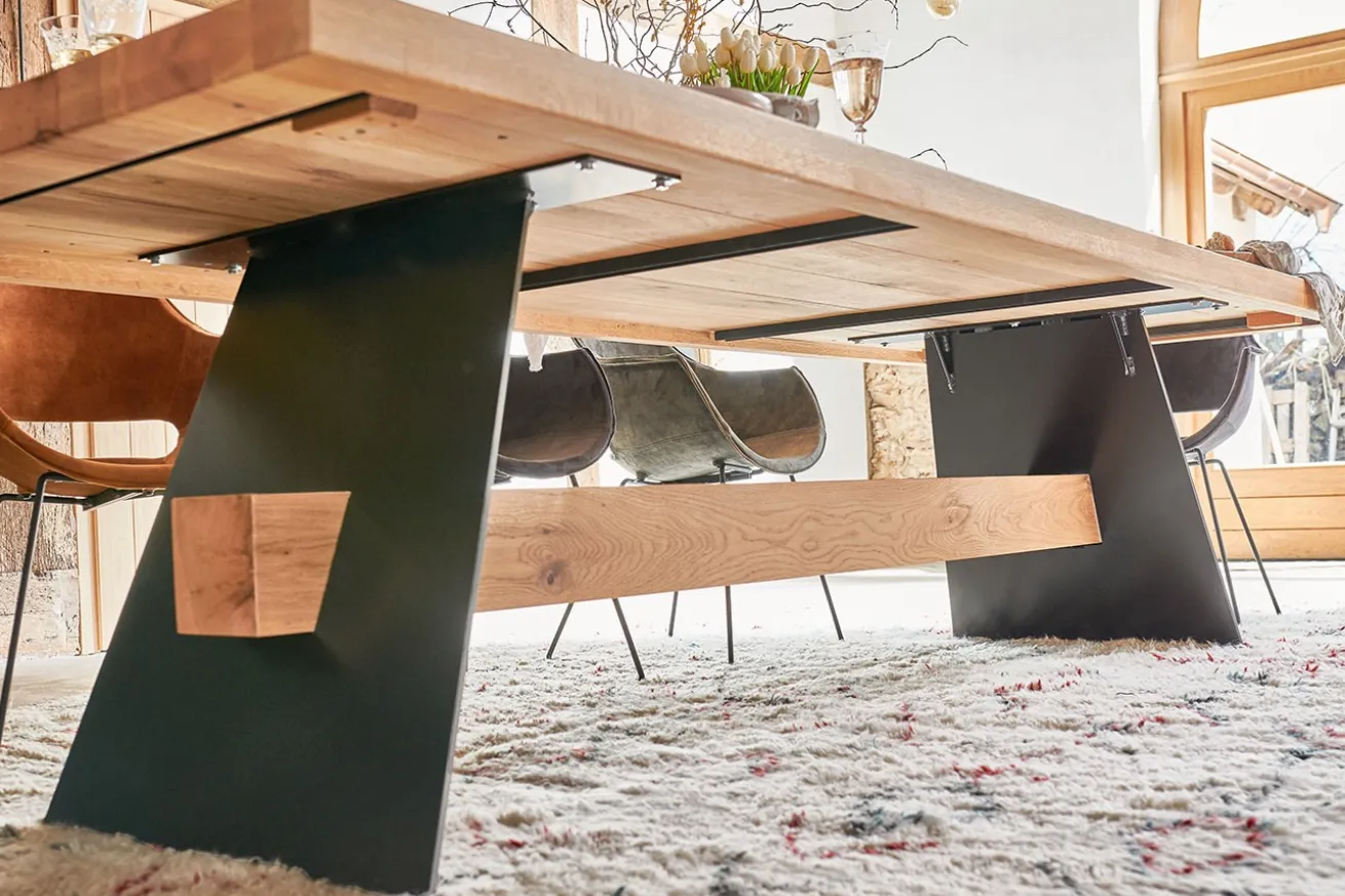 Die beiden Metallfüße in zeitlosem Schwarz sorgen nicht nur für Stabilität, sondern setzen auch einen modernen Akzent. Die Kontrastwirkung zwischen dem dunklen Metall und dem warmen Holz verleiht diesem Tisch eine zeitgemäße und dennoch rustikale Note.