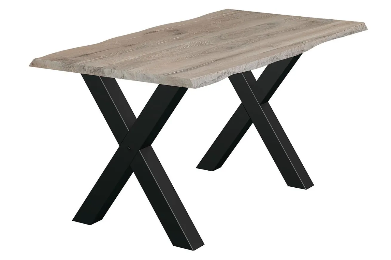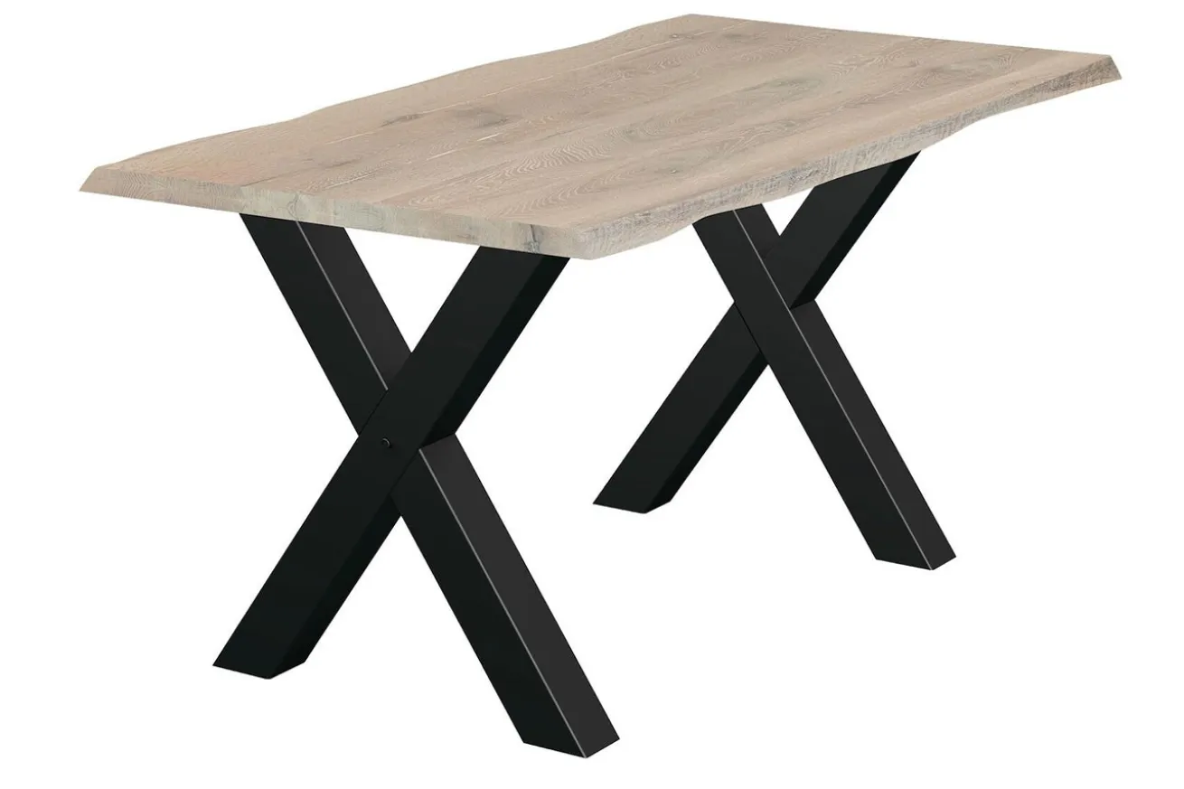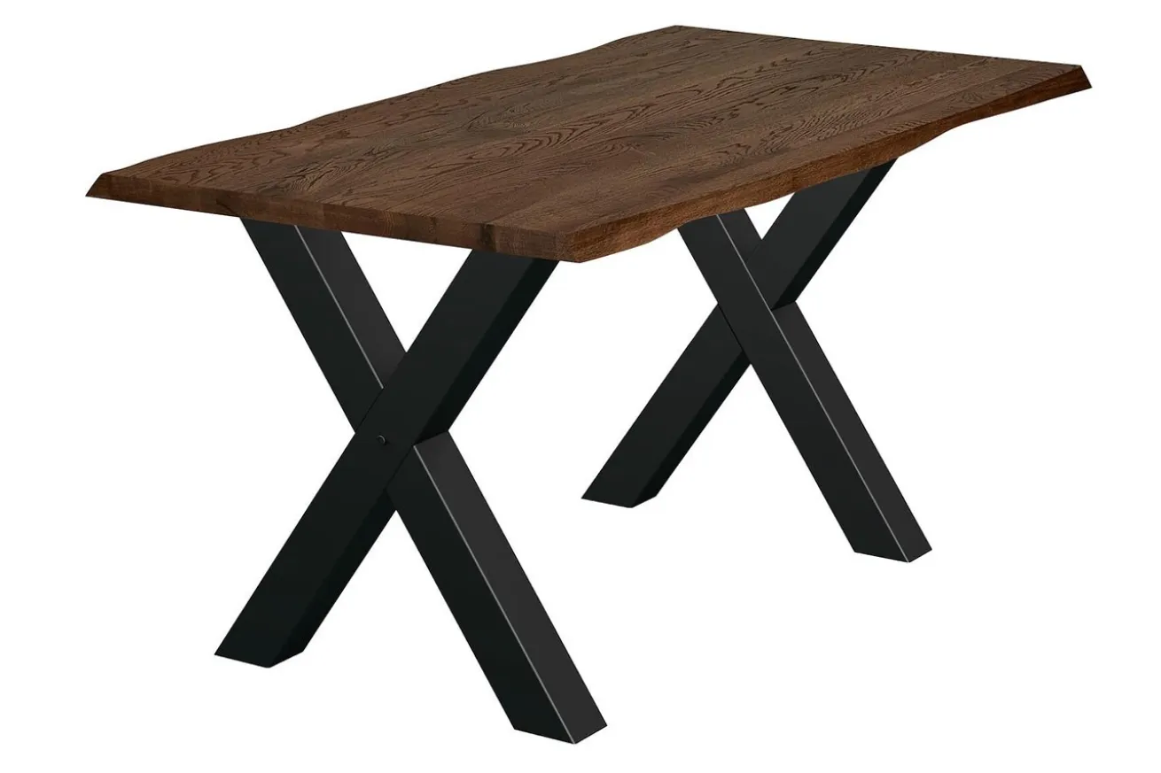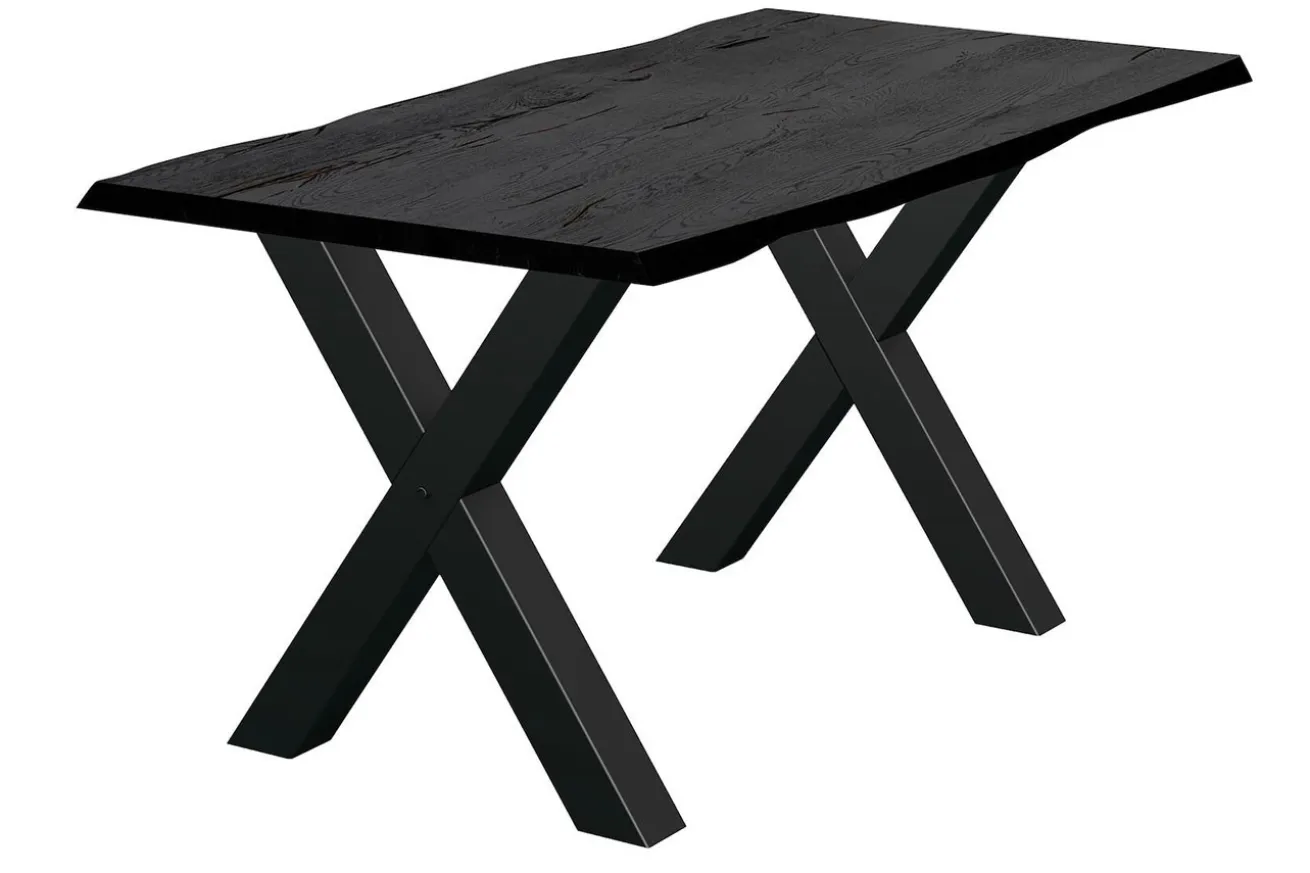 Die x-förmigen Füße aus robustem Metall in elegantem Schwarz setzen einen faszinierenden Kontrast zur natürlichen Holzplatte und verleihen dem Tisch eine moderne Ästhetik. Ihre stabile Konstruktion gewährleistet eine solide Standfestigkeit und verleiht dem Tisch gleichzeitig eine markante visuelle Präsenz.