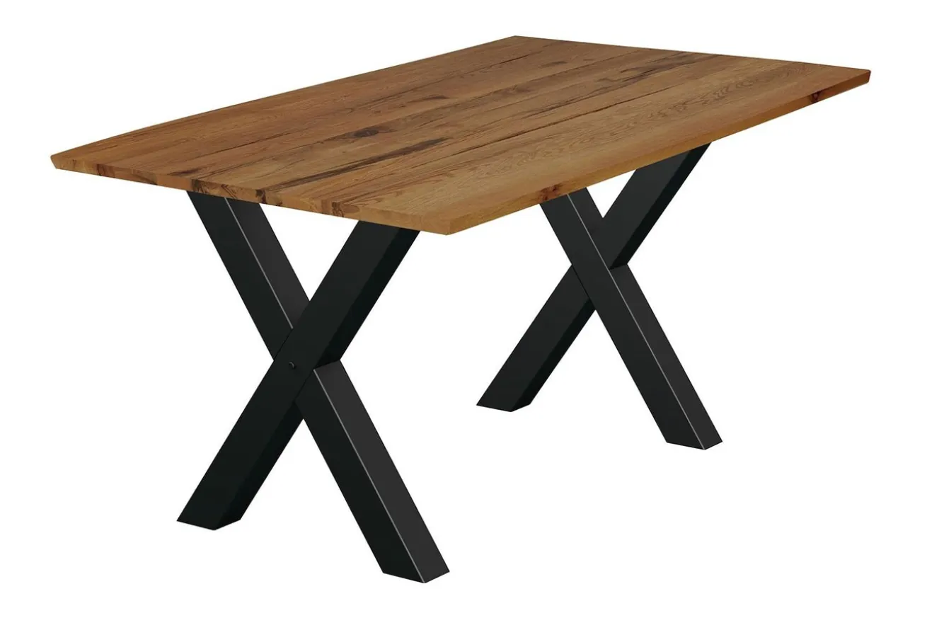 Entdecken Sie die natürliche Schönheit und die moderne Eleganz unseres Esstisches, der aus einer massiven Holzplatte aus rustikalem Eichenholz in naturfarbener Schönheit gefertigt ist. Mit einer makellos lackierten Oberfläche und markanten x-förmigen Metallfüßen in elegantem Schwarz vereint dieser Tisch rustikalen Charme mit zeitgemäßem Design und wird zum Blickfang in jedem Essbereich.