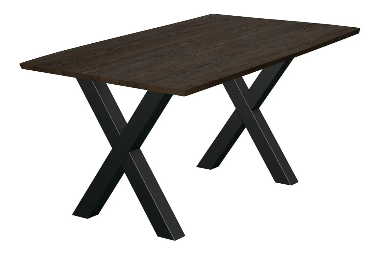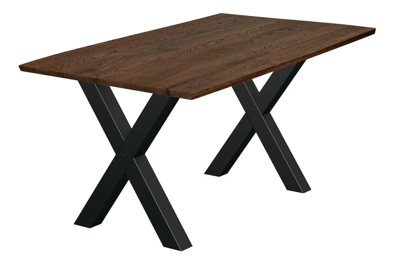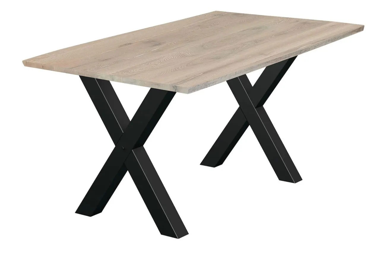 Die x-förmigen Metallfüße in Schwarz setzen einen faszinierenden Kontrast zur warmen Natürlichkeit des Eichenholzes und verleihen dem Tisch eine moderne Ästhetik. Ihre robuste Konstruktion gewährleistet Stabilität und Langlebigkeit, während ihr markantes Design dem Tisch eine besondere Note verleiht.