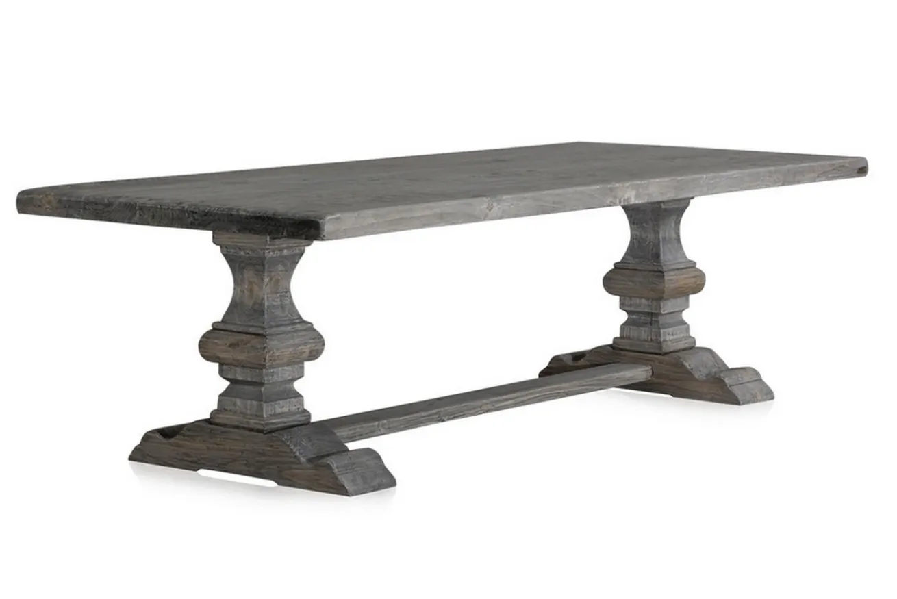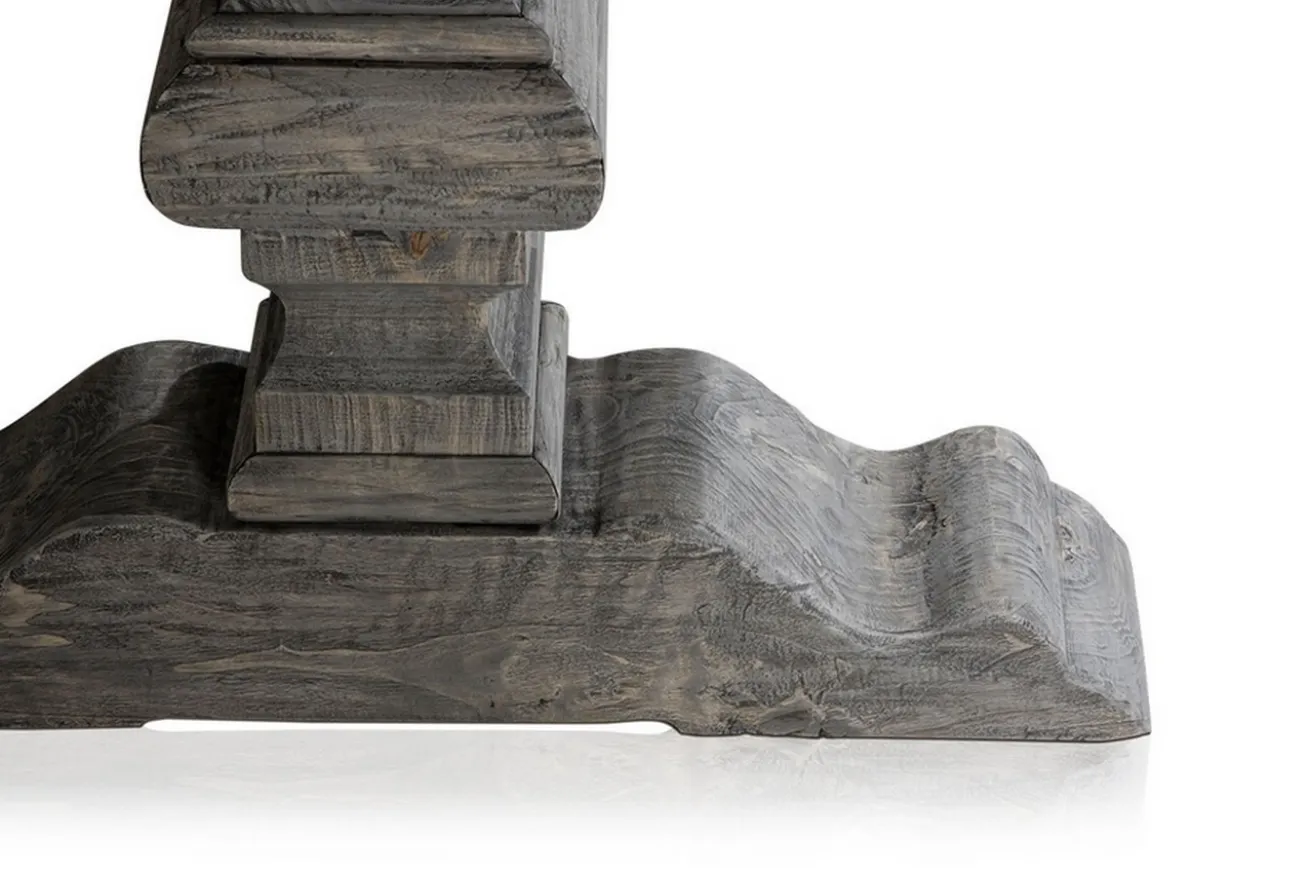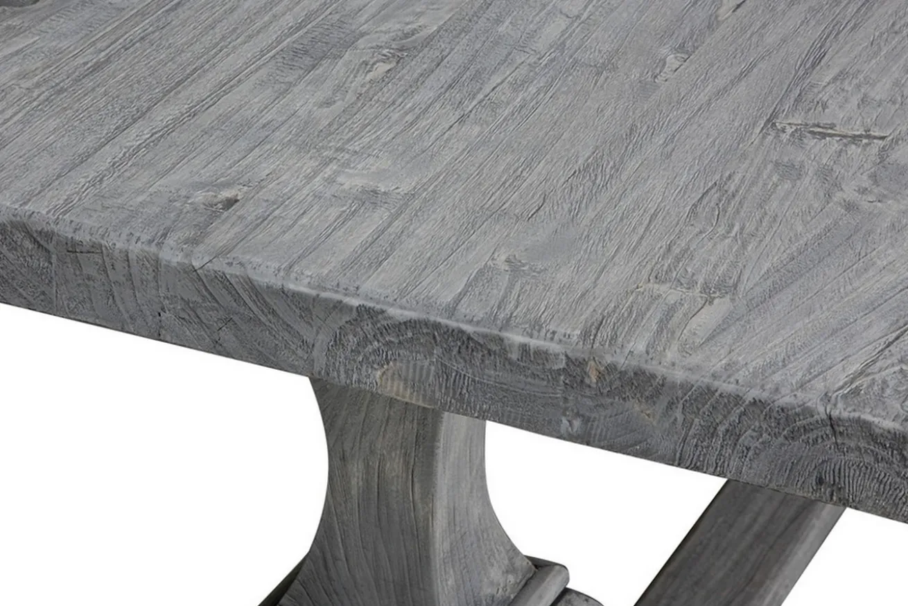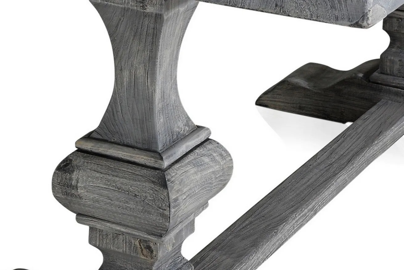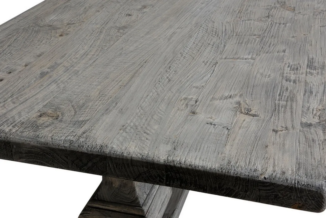 Es gibt Esstische in allen möglichen Brauntönen, warum dann nicht auch in grau? Dieser Landhaustisch besteht komplett, also Platte UND Beine, aus massivem Altholz, nämlich Teak. Er hat die Maße Breite 180cm, Tiefe 90cm und Höhe 76cm. Die Tischplatte hat eine Stärke von 5cm. Da es sich um recyceltes Holz handelt, weist der Tisch Gebrauchsspuren auf der Platte auf, aber auch die Färbung deutet darauf hin, dass das Massivholzmöbel schon alt ist. Denn die graue Farbe ist eine für dieses Holz typische Färbung, die durch intensive UV-Einstrahlung entsteht, wenn das Massivholzprodukt draußen steht. Deshalb lässt sich das Möbelstück aus Holz genauso gut drinnen wie draußen hinstellen. Und genau deswegen ist dieser Holztisch etwas ganz Besonderes. Die Oberfläche ist unbehandelt, wurde aber versiegelt, um die Gebrauchsspuren zu schützen und dem Massivholztisch einen besonderen Touch zu verleihen. Denn was recycelt ist, dessen vorheriger Gebrauch sollte auch zu sehen sein und geschätzt werden. Durch seine Färbung hat er nicht den typischen Esszimmer-Stil, aber genau da gehört er hin: In ein schönes, helles Esszimmer, das nur darauf wartet, mit anderen Möbelstücken in grau oder schwarz, wie den passenden Stühlen, kombiniert zu werden. Der Mehrzwecktisch eignet sich aber auch genauso gut als Arbeitstisch, denn mit seinem Aussehen ist er ein Eyecatcher in jedem Raum.
