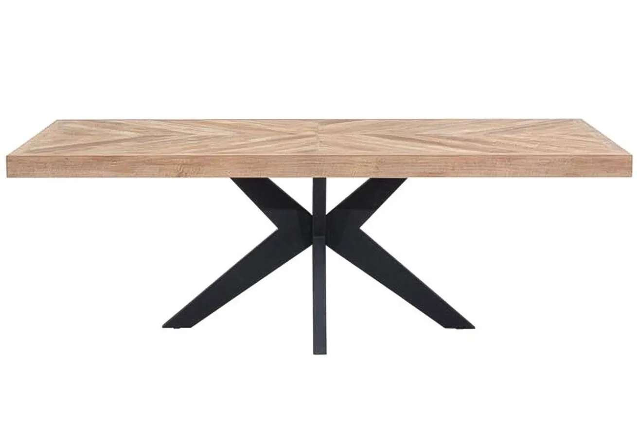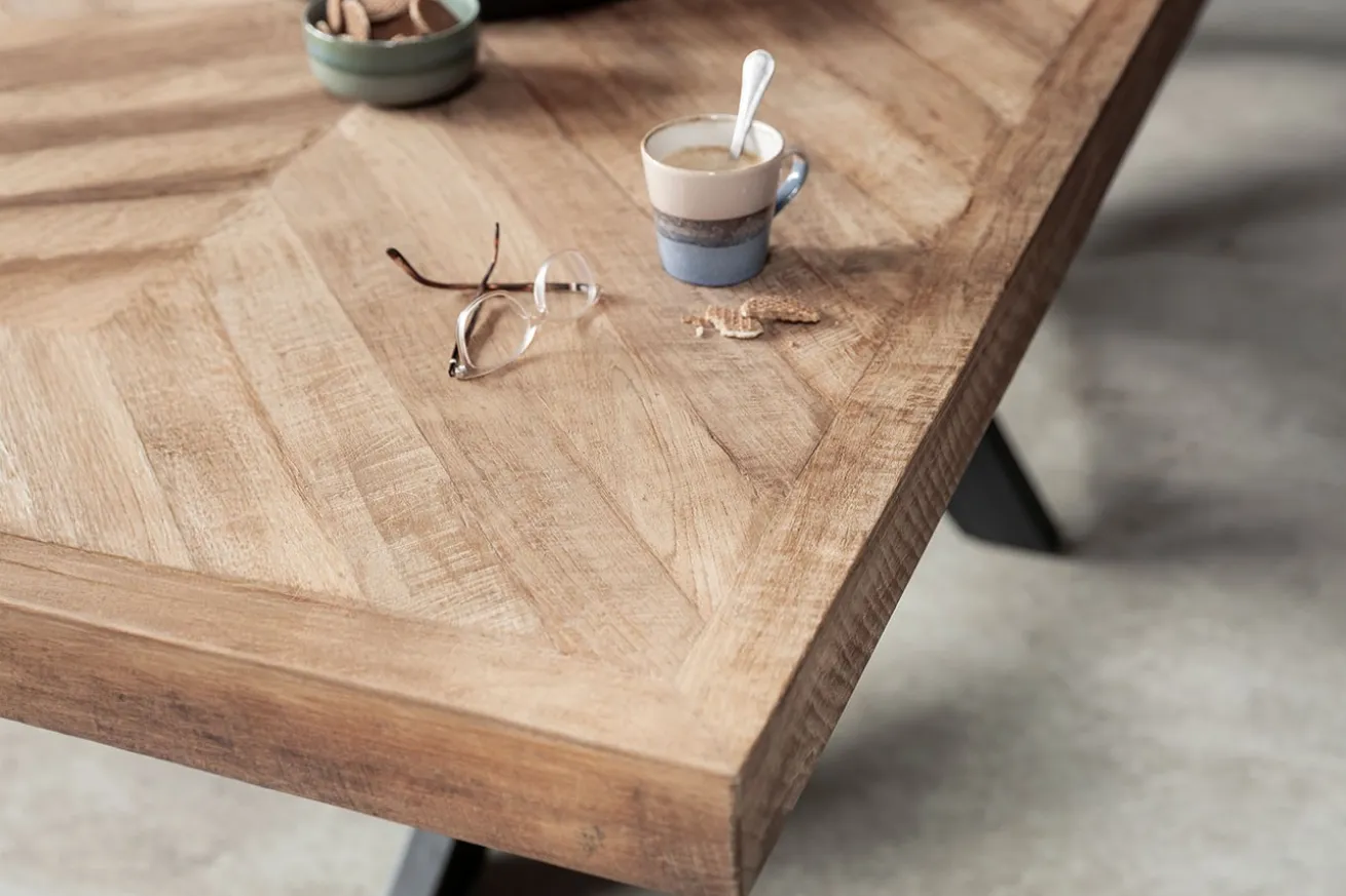 Erleben Sie die Schönheit der Natur in Ihrem Essbereich mit unserem rechteckigen Esstisch, der mit einer Teakholztischplatte in Fischgrätoptik verzaubert. Dieses Meisterwerk des Handwerks kombiniert die zeitlose Eleganz von Teakholz mit einem modernen Twist, der Ihrem Raum eine einzigartige Ausstrahlung verleiht.
