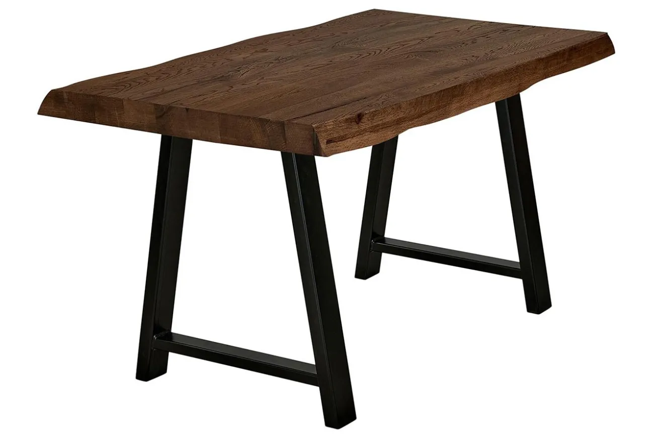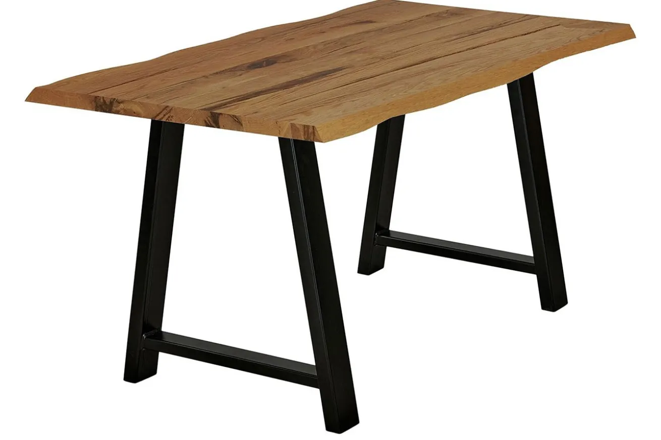 Die Platte aus massivem Eichenholz ist mit einer hochwertigen Lackierung versehen, die nicht nur die natürliche Schönheit des Holzes betont, sondern auch für eine strapazierfähige Oberfläche sorgt. Die Baumkante entlang der Tischplatte verleiht dem Tisch einen rustikalen Charme und unterstreicht seine natürliche Herkunft.