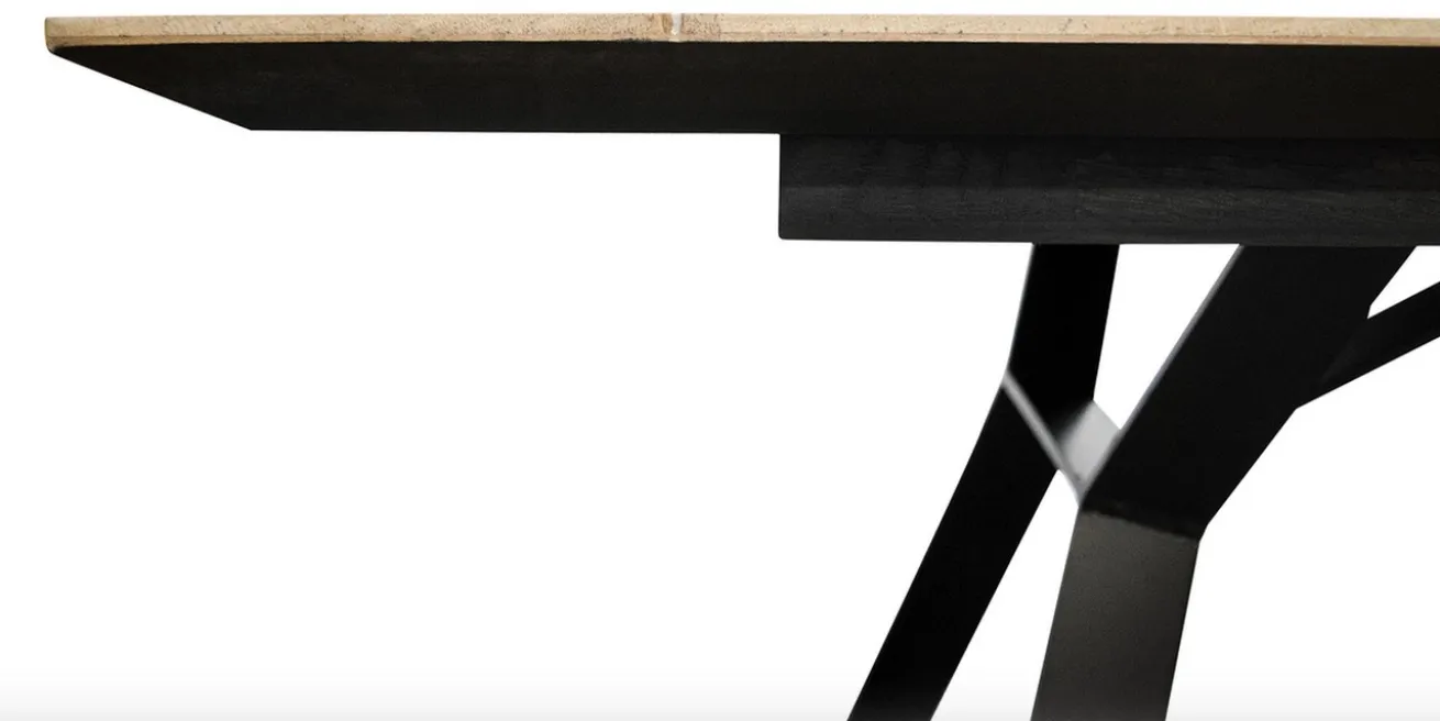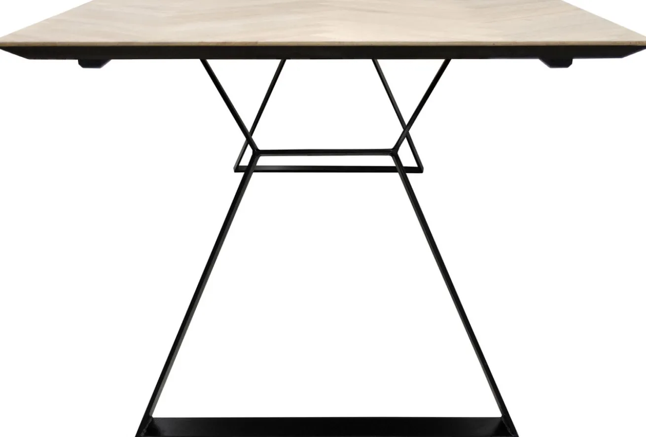 Dieser besondere Esstisch mit den Maßen Breite 200cm, Tiefe 100cm und Höhe 76,5cm ist eher eine Speisetafel als ein gewöhnlicher Tisch, an dem sehr viele Gäste und die ganze Familie Platz nehmen können. Der Holztisch besteht aus einer Platte aus Eichenfurnier und einem Stahlgestell. Ein Furnier ist eine dünne Holzschicht, die vom Baum abgetragen und auf eine Platte aufgeleimt wird. Hier ist es allerdings anders, da es sich um ein Fischgrätmuster handelt. Das Stahlgestell besteht aus zwei Beinen und steht im Kontrast zu der helleren, lackierten Tischplatte und verleiht dem Produkt so einen skandinavischen Flair. Deshalb eignet sich dieses Produkt perfekt für Esszimmer in genau diesem Stil, wo Schlichtheit und Eleganz im Zusammenspiel einladend wirken.