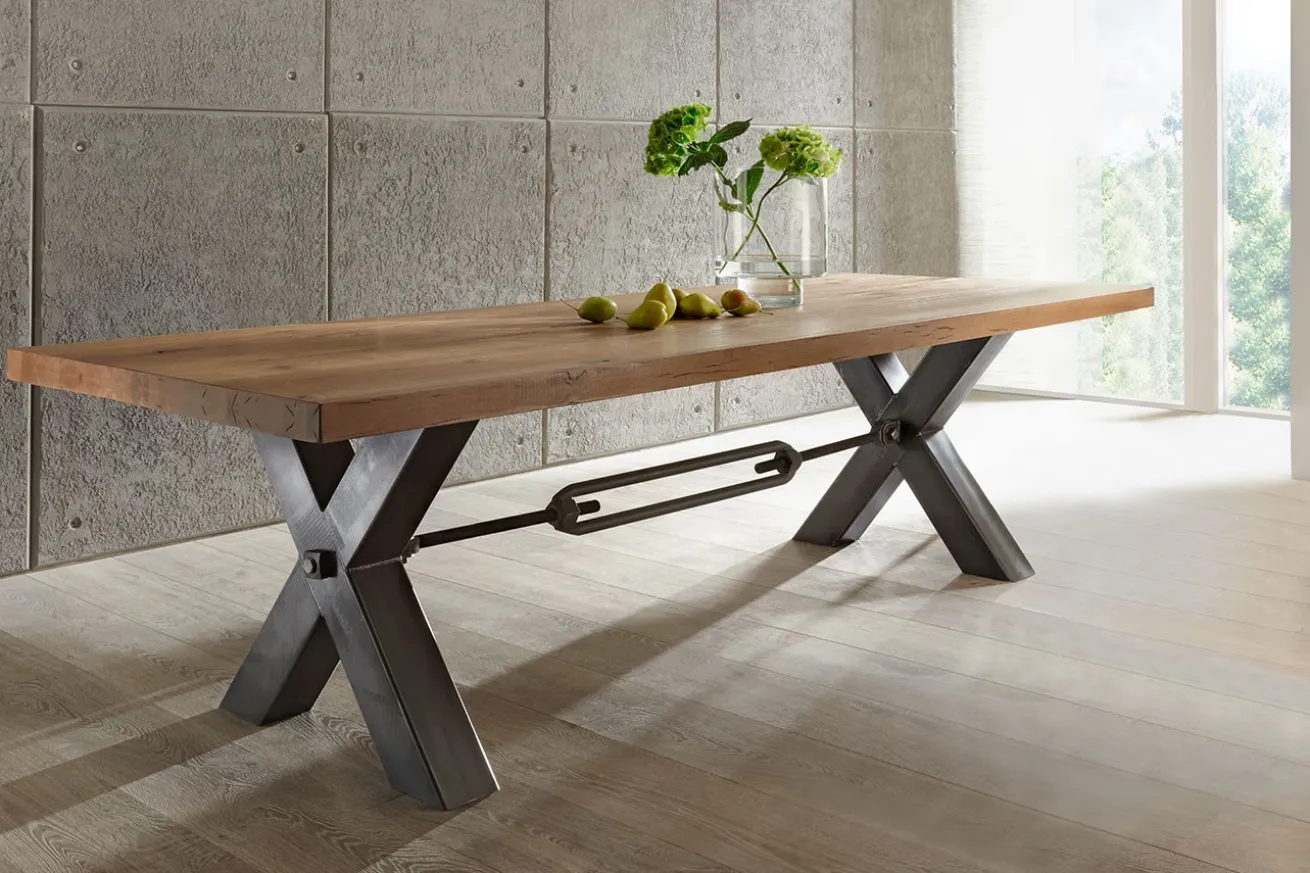 Unser Esstisch aus rustikalem Eichenholz mit natürlicher Baumkante und X-förmigen Metallfüßen ist die perfekte Wahl, um Familie und Freunde zu versammeln und gemeinsam unvergessliche Mahlzeiten zu genießen. Dieser Tisch wird Ihr Esszimmer in ein Zentrum der Bewunderung verwandeln.