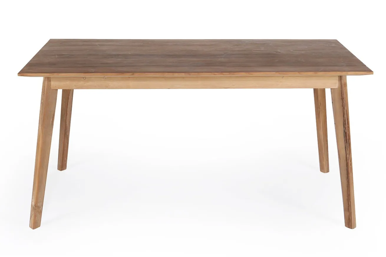 Der Tisch kommt mit einer Breite von 90cm, einer Höhe von 76cm und einer Tiefe von 180cm und hat vier etwas ausgestelltere Beine. Zudem wird die Dinierfläche von Tischzargen zusammengehalten. Dieses rechteckige Objekt eignet sich perfekt für Esszimmer und Küche im Landhaus- oder Retrostil.