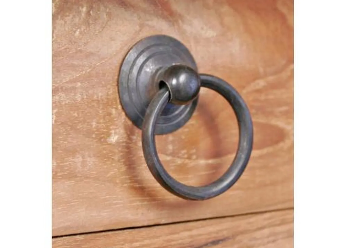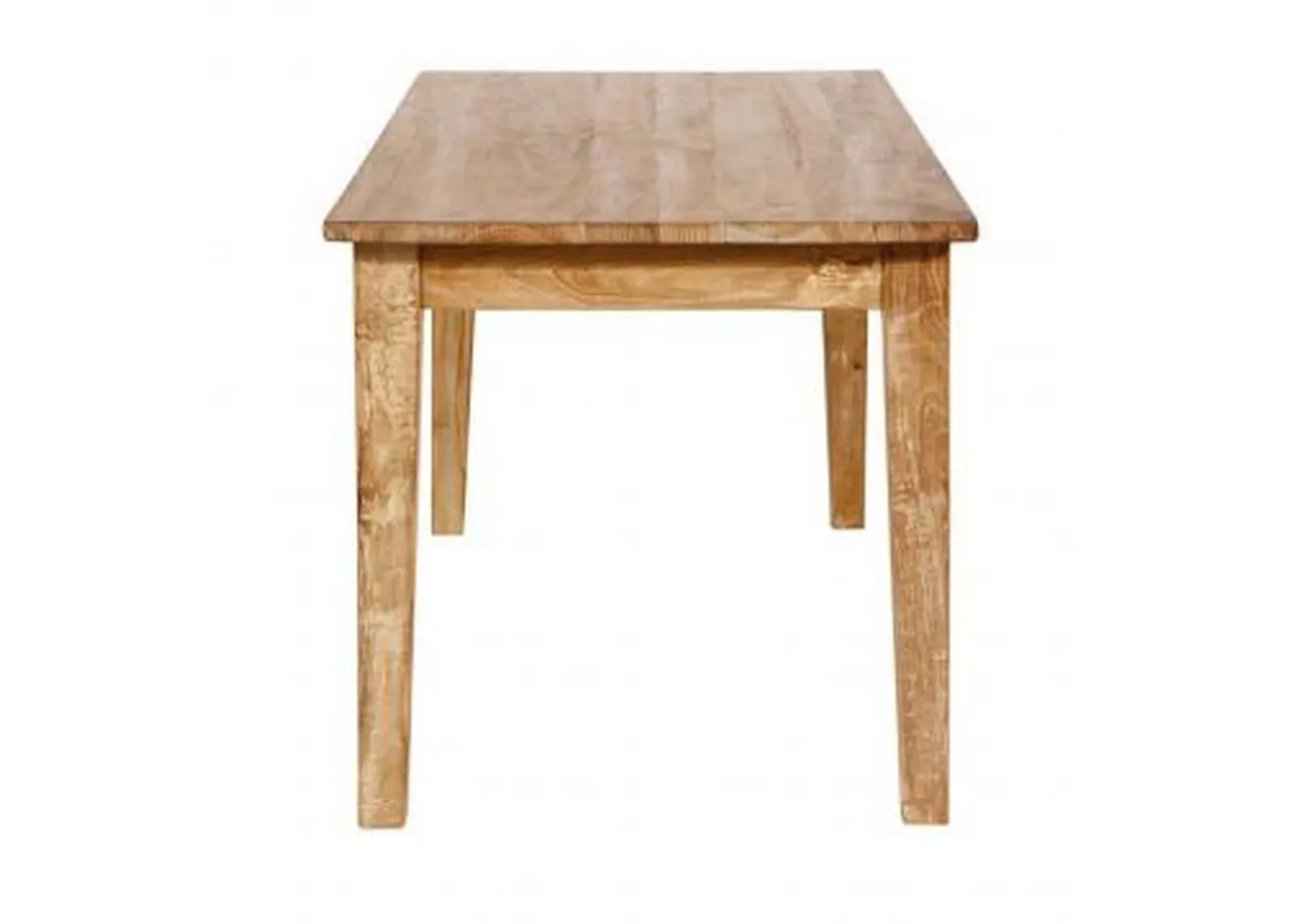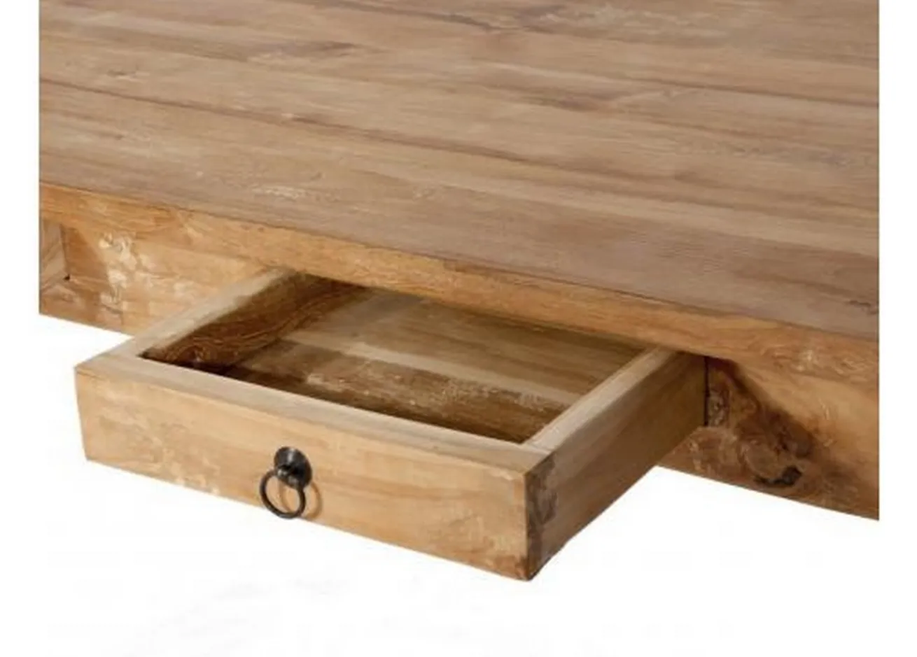 Dieser wunderschöne Esstisch aus recycltem Teakholz in den Maßen Breite 120cm, Höhe 78cm und Tiefe 70cm sieht nicht nur aus wie ein Hingucker, sondern ist es auch durch seine unbehandelte Oberfläche und seine Naturfarbe, die wir ihm gelassen haben. Die zwei Schubladen, die er versteckt hält, bieten sich dank der schwarzen Metall-Ringgriffe bestens dafür an, kleine Dekoobjekte oder Servietten zu verstauen.