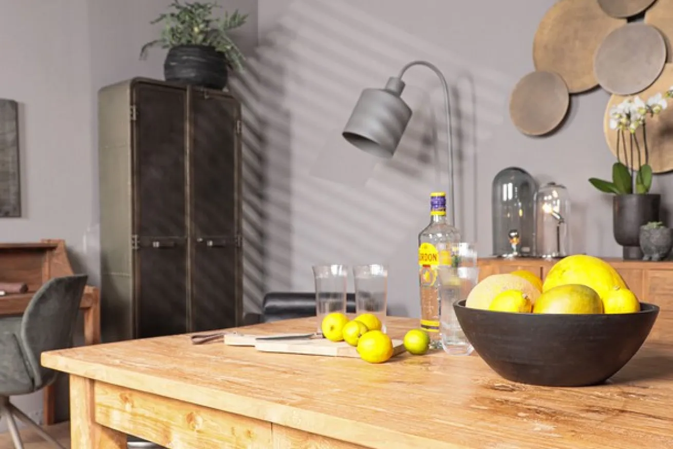 Dieser wunderschöne Esstisch aus recycltem Teakholz in den Maßen Breite 200cm, Höhe 78cm und Tiefe 100cm sieht nicht nur aus wie ein Hingucker, sondern ist es auch durch seine unbehandelte Oberfläche und seine Naturfarbe, die wir ihm gelassen haben. Die zwei Schubladen, die er versteckt hält, bieten sich dank der schwarzen Metall-Ringgriffe bestens dafür an, kleine Dekoobjekte oder Servietten zu verstauen.