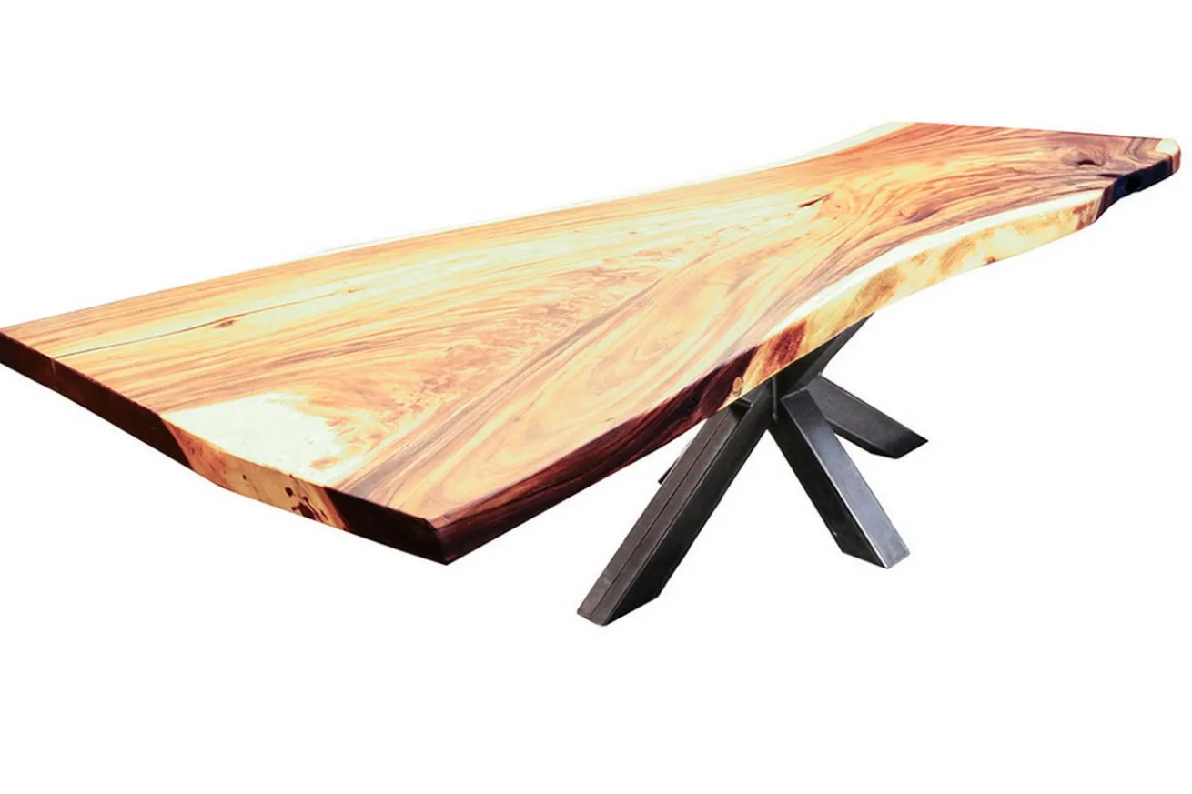 Wenn man schon einen Esstisch individuell zusammenstellen kann, dann kann man auch außergewöhnliches Holz mit einem besonderen Tischgestell kombinieren so wie unser Produkt, das aus Suarholz und Roheisen besteht.