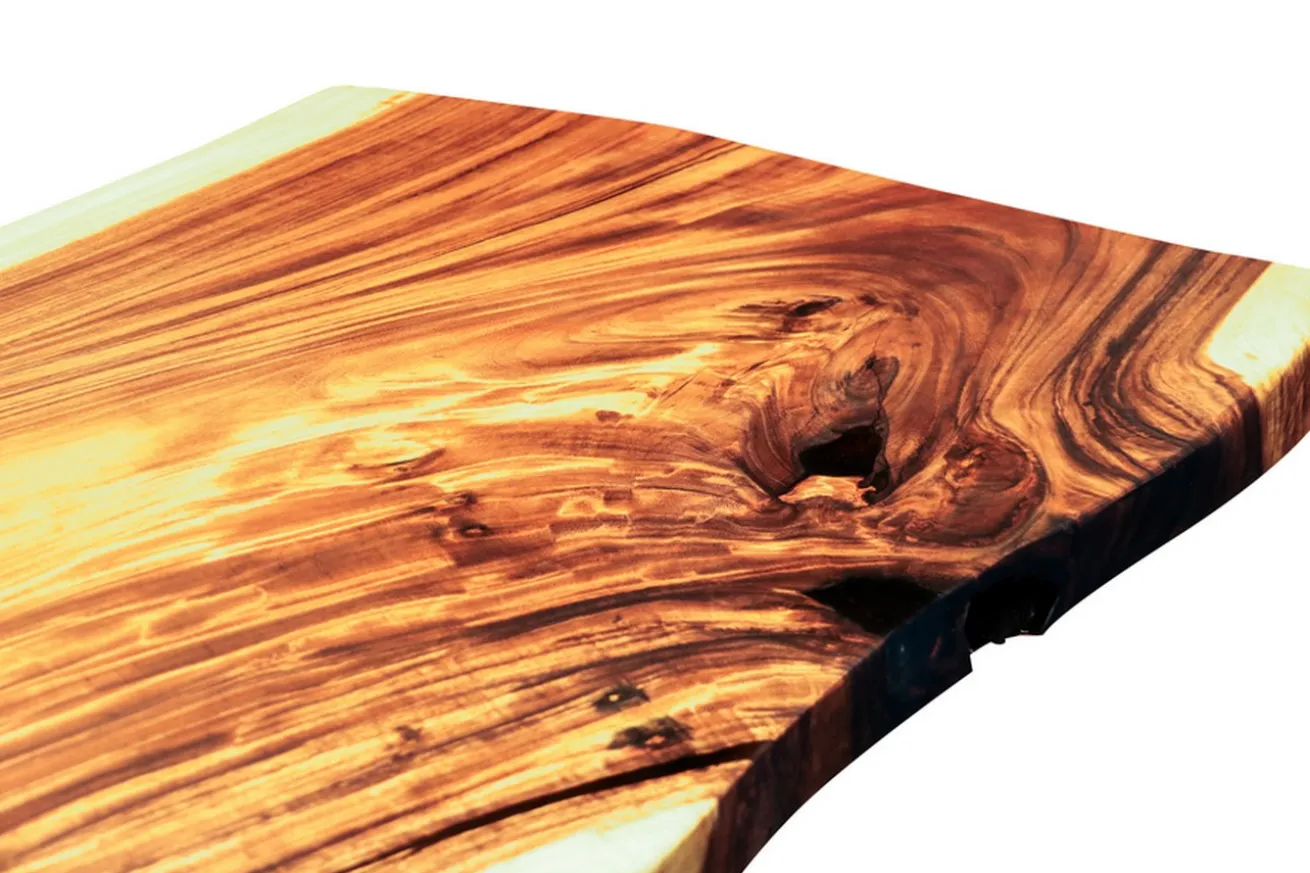 Das Massivholz, das aus der Akazie entspringt, weist über eine breite Farbpalette über rosa zu gelb auf. Die Besonderheit an dieser Tischplatte ist, dass sie aus genau einer Baumscheibe besteht, was man nicht nur an der sanduhrförmigen Plattenform erkennt, sondern auch daran, dass das gelbliche Splintholz am Rand darauf hinweist. Splint ist nämlich die erste Holzschicht nach der Baumrinde.