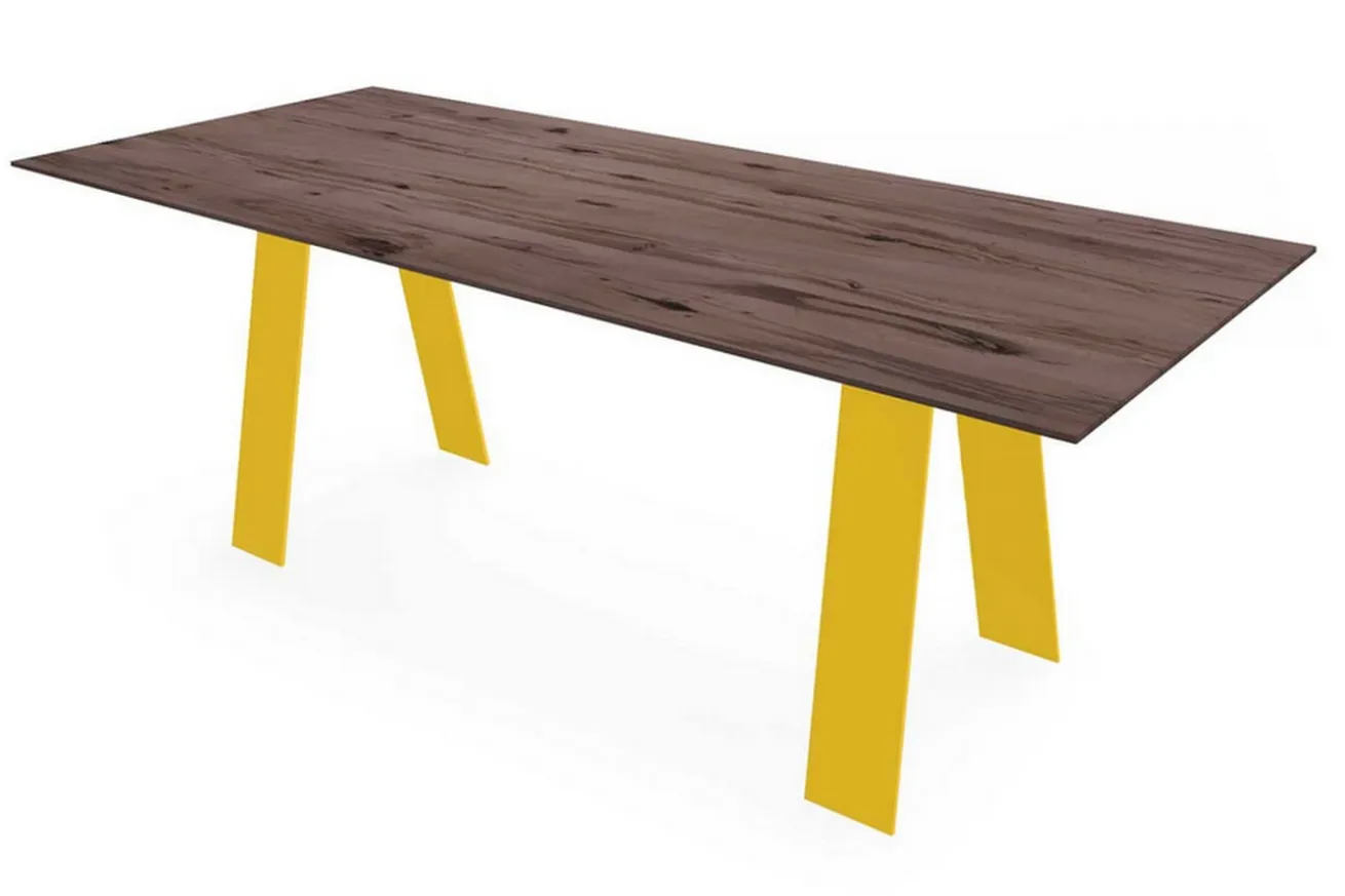Dieser Esstisch aus Buche Massivholz und einem robusten Gestell aus Zinkgelb pulverbeschichtetem Stahl, hinterlässt einen bleibenden Eindruck. Das Möbelstück für Küche und Esszimmer hat eine Breite von 160cm, eine Tiefe von 80cm und eine Höhe von 76cm sowie eine Plattenstärke von 3cm. Die Oberfläche der Platte aus Wildbuche wurde geölt. Da der Rand eine schweizer Kante hat, ist die Plattenstärke nicht direkt erkennbar.