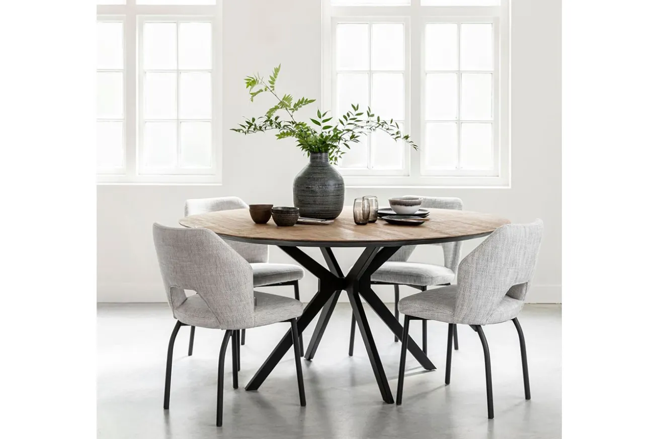 Entdecken Sie die Kunst des Zusammenseins mit unserem runden Esstisch, der nicht nur Mahlzeiten, sondern auch Erinnerungen in Ihrem Zuhause verankert. Mit einer Platte aus recyceltem, unbehandeltem Teakholz und einem schlanken schwarzen Metallgestell verkörpert dieser Tisch die perfekte Kombination aus rustikaler Wärme und modernem Stil.