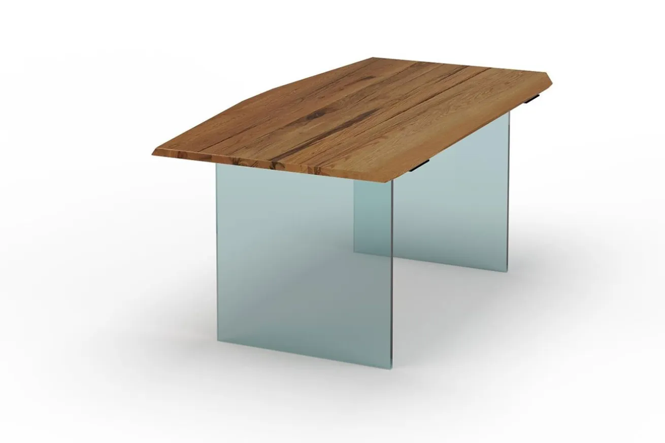 Die harmonische Verbindung von Holz und Glas wird durch die transparenten Glaswangen auf die Spitze getrieben. Diese modernen Elemente schaffen eine einzigartige Balance zwischen Robustheit und Leichtigkeit, während das Massivholz im Mittelpunkt bleibt. Der Kontrast zwischen der eindrucksvollen Holzplatte und den transparenten Glaswangen schafft eine visuelle Spannung, die jeden Raum bereichert.