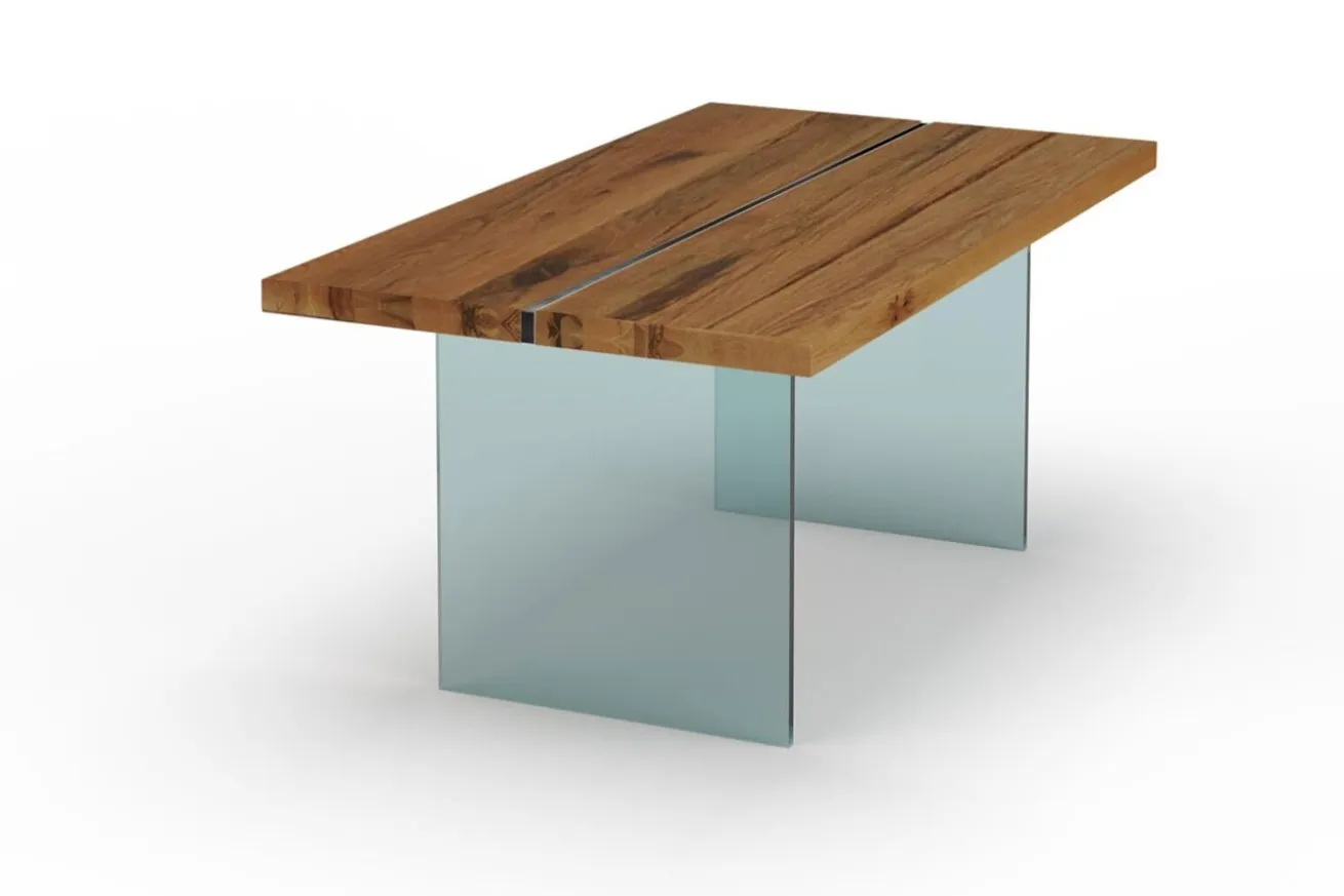 Die Kombination von Holz und Glas wird durch die transparenten Glaswangen perfektioniert. Diese modernen Elemente verleihen dem Tisch eine luftige Leichtigkeit und setzen gleichzeitig das Massivholz in den Fokus. Der Kontrast zwischen der robusten Holzplatte und den transparenten Glaswangen schafft ein faszinierendes visuelles Spiel, das jeden Raum bereichert.