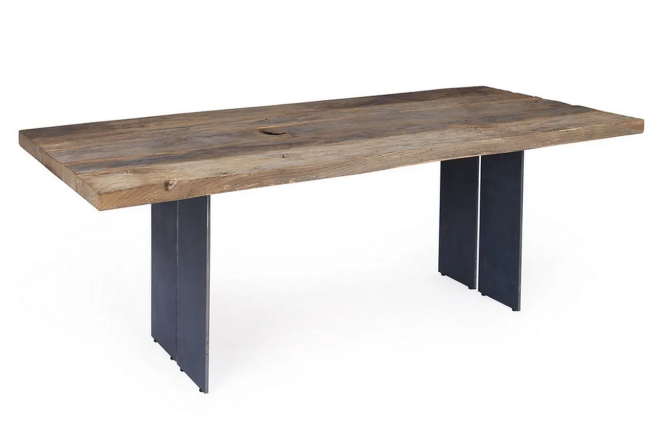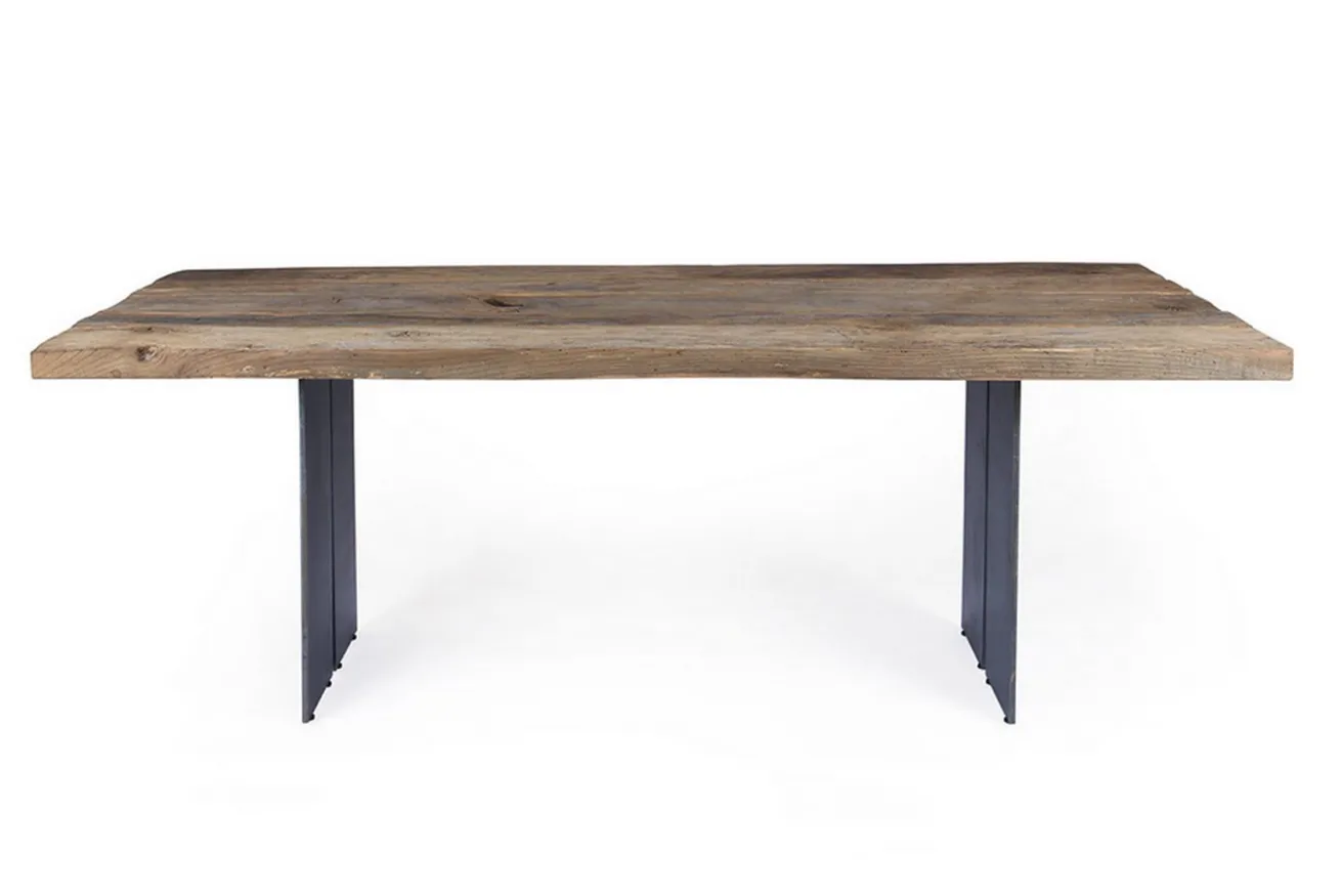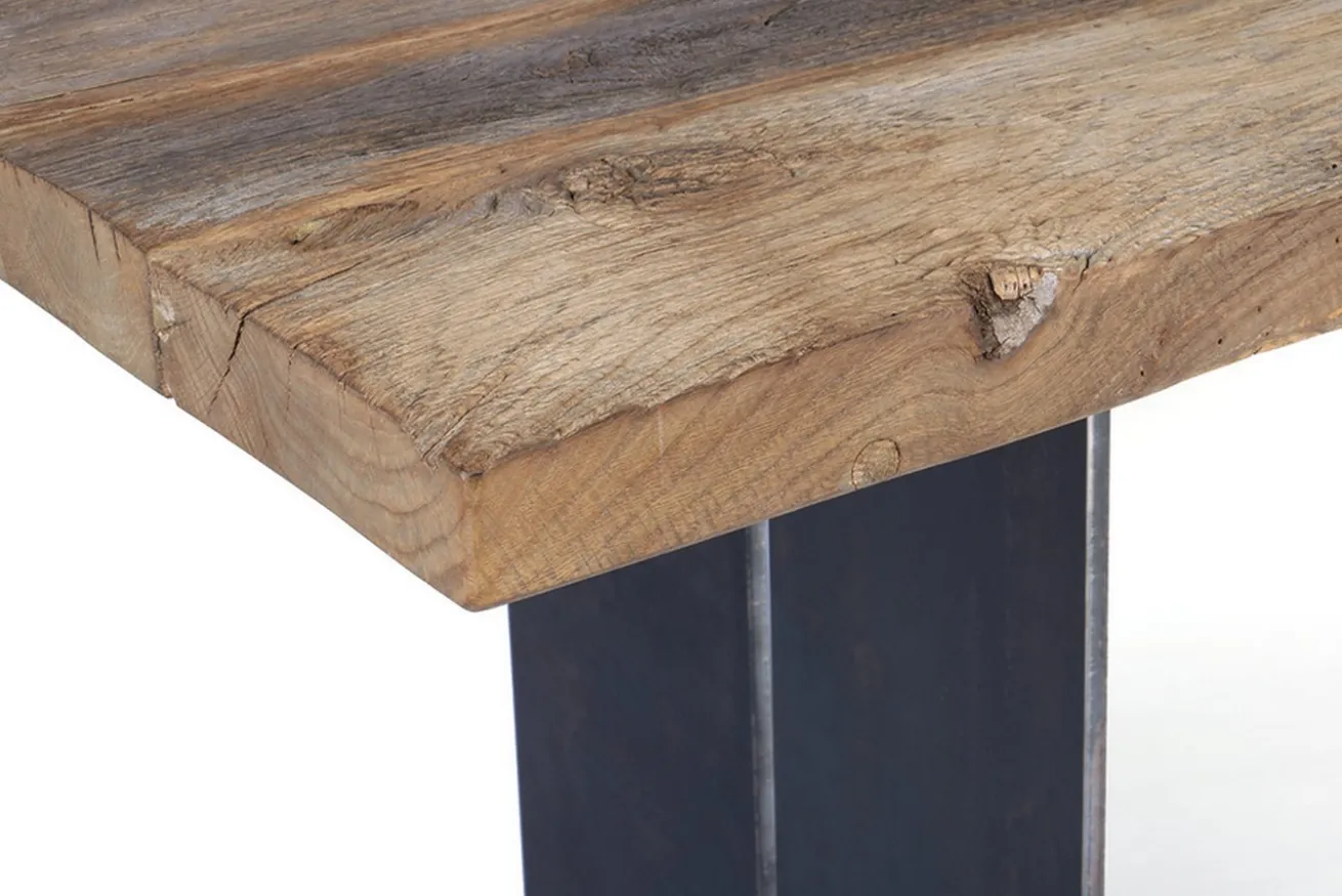 „Rico“ ist ein kleiner Aufreißer. Denn er ist nicht nur ein Tisch aus dem Massivholz Eiche, sondern gleich einer, der aus Alt-Eiche gefertigt wurde. Er hat die Maße Breite 220cm, Tiefe 100cm und Höhe 78cm. Diese 6cm starke massive Alt Eiche Tischplatte ist ein absolutes Unikat und weist ihren einmaligen unverwechselbaren Charakter auf. Dieser ist durch seine Naturfarbe entstanden, die würdevoll gegraut ist. Die Oberfläche wurde gebürstet, so dass der Alterungsprozess des im Hausbau sehr begherten Möbelholzes noch deutlicher zum Vorschein kommt. Zudem zeichnet sich die Platte durch eine gerade Kante aus. Diese Geradlinigkeit spiegelt sich in den Tischbeinen wieder. Denn sie wird von zwei stabilen Stahlwangen getragen. Die Farbe der Tischuntergestelle ist anthrazit. Somit entsteht ein unverwechslebarer Designcharakter im angesagten Industrie Look. Der dadurch modern wirkende Massivholztisch überzeugt somit in jedem designorientierten Esszimmer als absolutes Einzelstück.