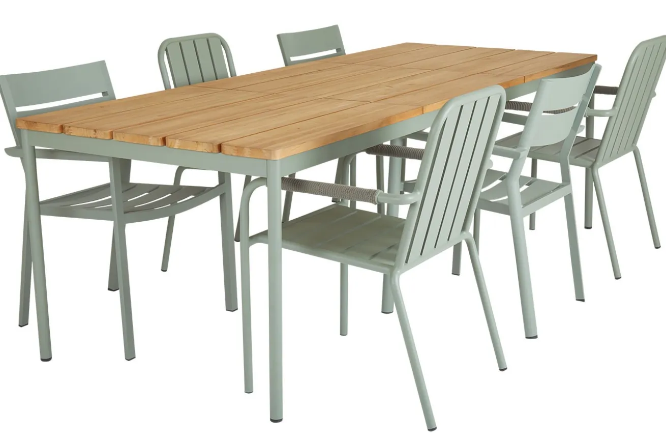 Kreieren Sie mit Nox einen charmanten Terrassenbereich im modernen Stil. Mit seiner Platte aus Teakholzlamellen und seinem Gestell aus grün pulverbeschichtetem Aluminium harmoniert er perfekt mit der Natur, die ihn umgibt und passt sich so hervorragend seiner Umgebung an. Mit einer Breite von 238cm gleicht der Tisch einer Tafel und bietet ausreichend Platz für die gesamte Familie.