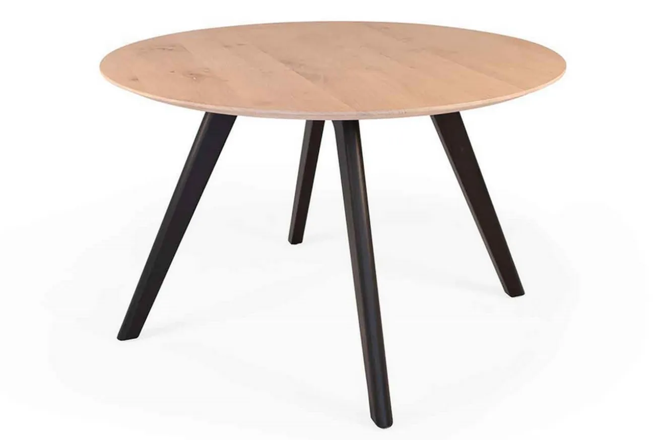Dieser Esstisch eignet sich mit einem Durchmesser von 100cm und einer Höhe von 75cm bestens für Essgruppen in kleiner Runde. Er besteht aus einer runden Eichenholzplatte und einem schwarzen Metallgestell mit vier Füßen, die abstehen.