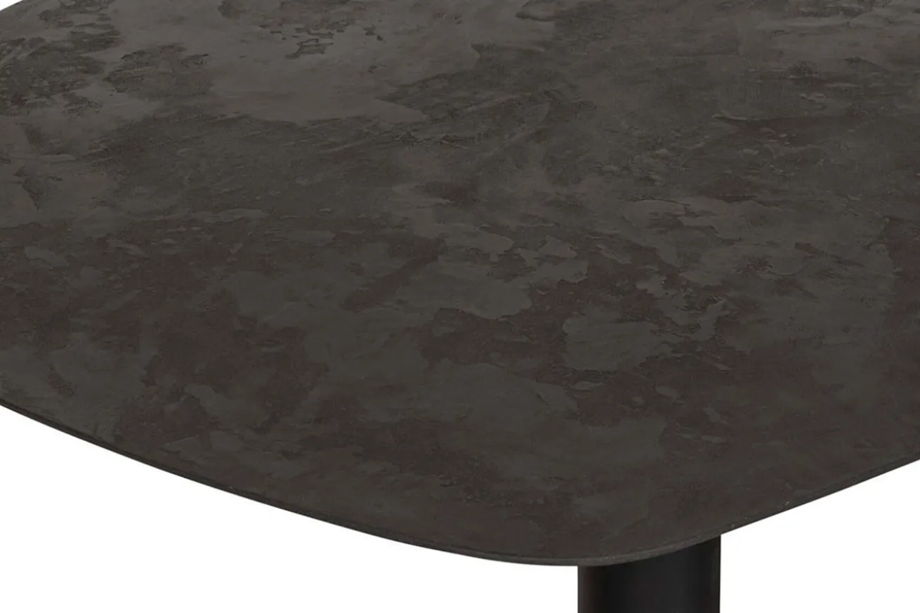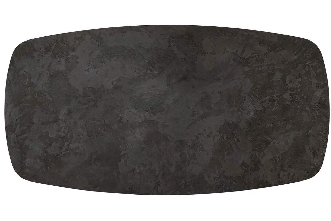 Die rechteckige Arbeitsplatte aus schwarzem Mortex besticht durch ihre markante Ästhetik und ihre robuste Haltbarkeit. Mit abgerundeten Kanten verleiht sie dem Tisch eine sanfte Note und eine angenehme Haptik, während das Mortex-Material ihm eine zeitgemäße Industrial-Optik verleiht.