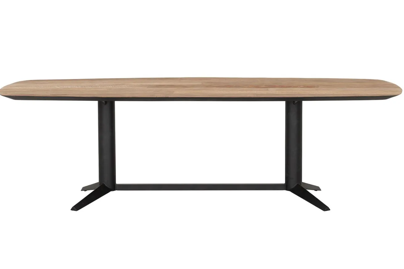 Die Tischplatte wird von einem stabilen 2-füßigen Mittelgestell aus robustem Metall in Schwarz getragen. Dieses Gestell bietet nicht nur eine solide Basis, sondern setzt auch einen markanten industriellen Akzent. Die klaren Linien des Gestells harmonieren perfekt mit der rustikalen Eleganz des Teakholzes und schaffen ein ausgewogenes Gesamtbild. Verleihen Sie Ihrem Essbereich mit unserem Esstisch im Industrial-Stil aus recyceltem Teakholz und Schwarzem Metallgestell zeitlose Eleganz und modernen Chic. Schaffen Sie einen Raum, der zum Verweilen und Genießen einlädt, und genießen Sie gemeinsame Mahlzeiten in stilvollem Ambiente.