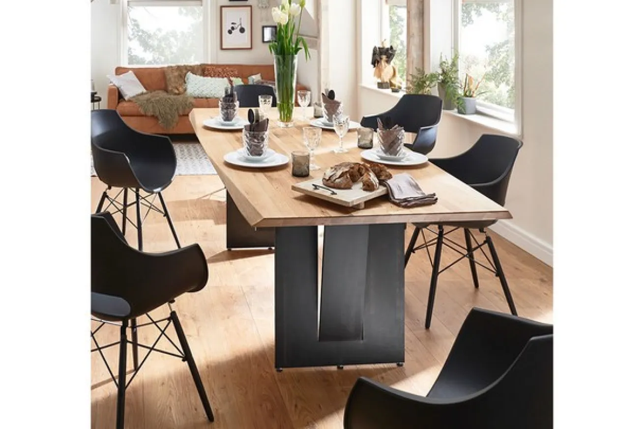 Ganz gleich, ob er im Herzen eines modernen Esszimmers, eines urbanen Lofts oder eines inspirierenden Arbeitsbereichs platziert wird – dieser Tisch wird definitiv die Aufmerksamkeit auf sich ziehen. Er lädt dazu ein, besondere Mahlzeiten zu genießen, tiefgehende Gespräche zu führen und die Grenzen der Kreativität in einem Umfeld aus Natürlichkeit und moderner Eleganz zu erkunden. Unser Esstisch aus Massivholz Wildeiche mit extremer Kante und schwarzen Metallwangen ist nicht nur ein Möbelstück, sondern eine Manifestation von kühnem Design und zeitgenössischer Raffinesse.