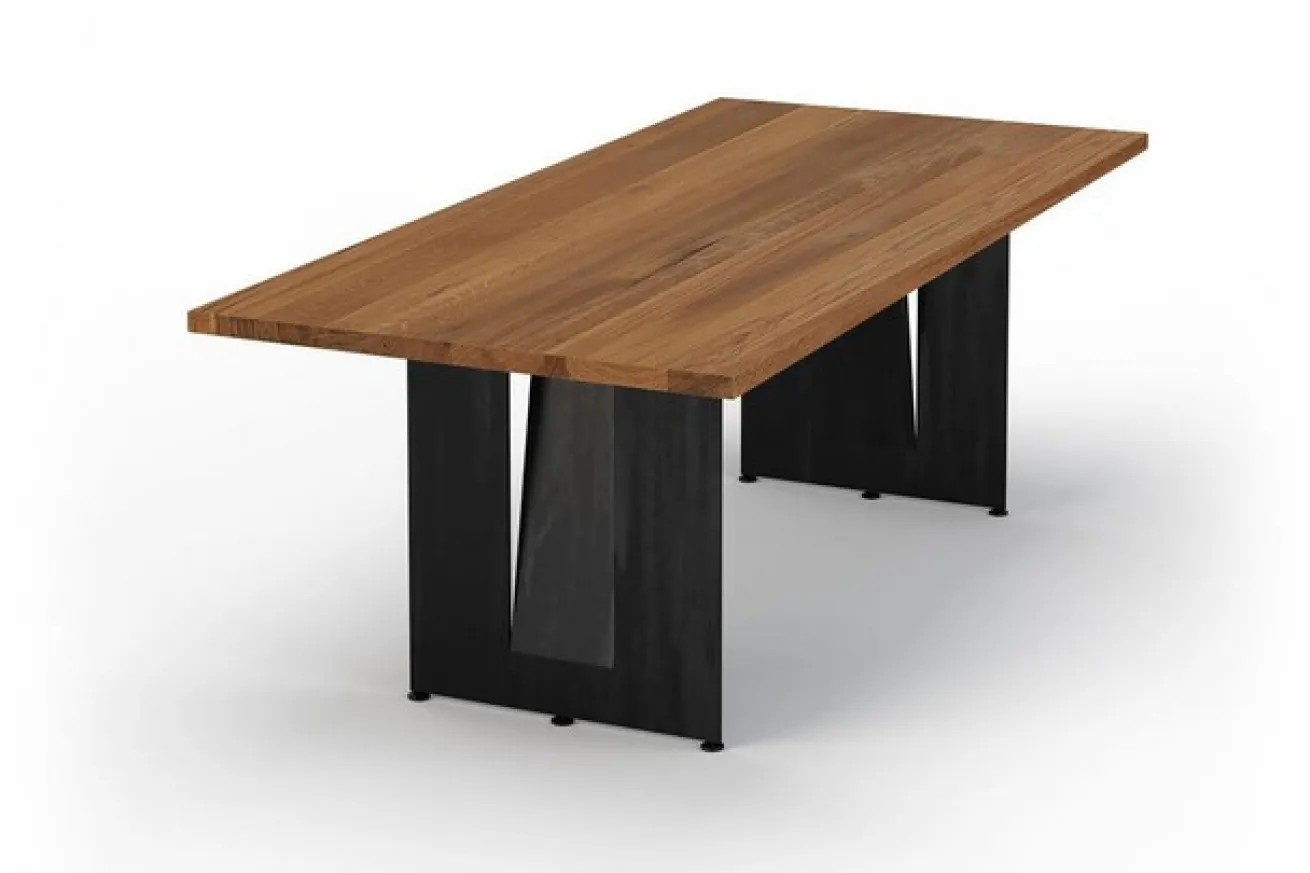 Die Verbindung von Holz und Metall wird durch die schwarzen Metallwangen erreicht. Diese markanten Elemente verleihen dem Tisch eine moderne Note und setzen gleichzeitig das warme Holz in den Fokus. Der Kontrast zwischen der organischen Natürlichkeit des Holzes und dem kühlen Metall schafft eine visuelle Spannung, die den Tisch zu einem wahren Blickfang macht.