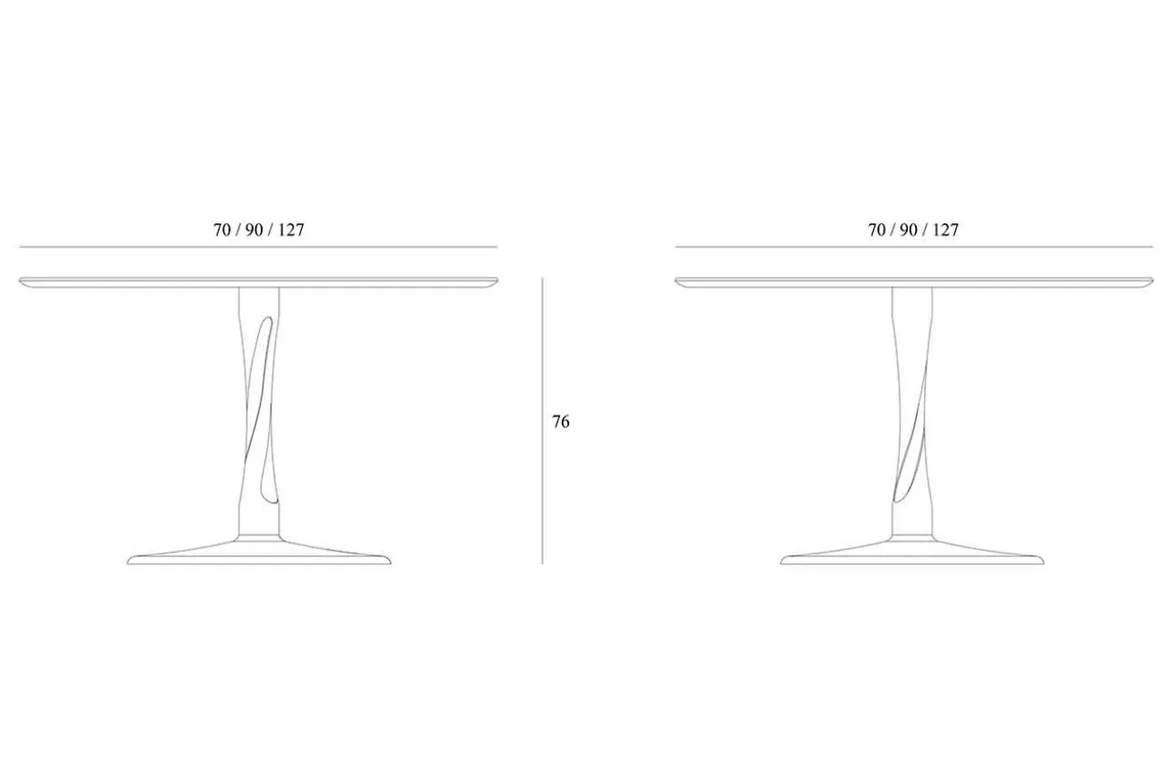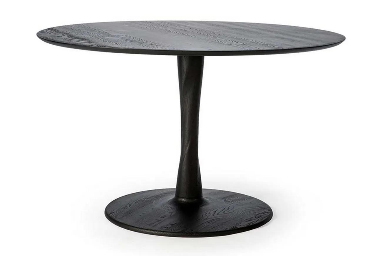 Zu geselligen Runden lädt der runde Küchentisch Torsion ein. Mit seiner schwarzen Lackierung zieht er in einer hellen Küche alle Blicke auf sich. Das aus massivem Eichenholz bestehende Möbelstück hat einen Durchmesser von 127cm und bietet Platz für vier Personen. Mit einer Höhe von 76cm ist Torsion weder zu niedrig noch zu hoch, um das gemeinsame Essen daran auszurichten oder Brettspiele zu spielen. Mit den passenden Möbeln zum Sitzen wie drehbaren Stühlen mit Armlehnen kann der Abend in vollen Zügen genossen werden. Und wenn Torsion mal nicht in Gebrauch ist, kann in die Mitte eine skulpturale Vase samt Blümchen den Tisch verschönern.