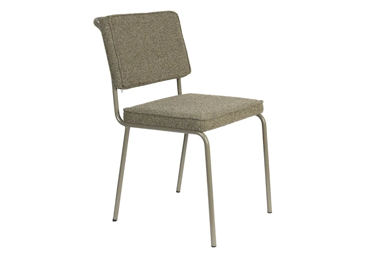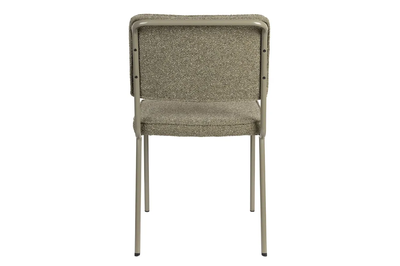 Was ihn besonders macht? Die gebogene Metallrückenlehne ist mehr als nur ein Design-Element – sie dient gleichzeitig als praktischer Griff. So lässt sich der Stuhl easy verrücken, ganz ohne Spuren am Stoff oder Herumgeschiebe.
