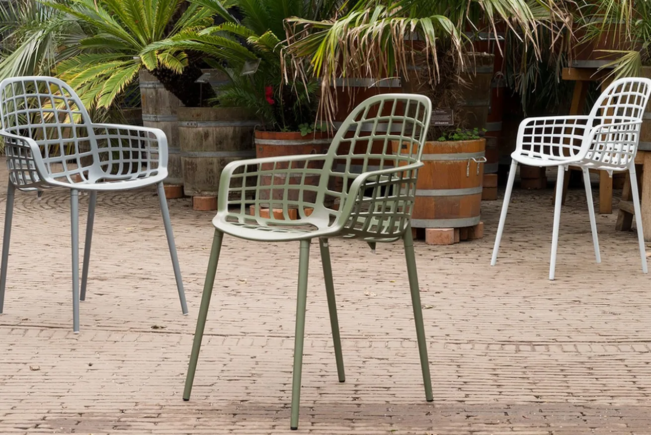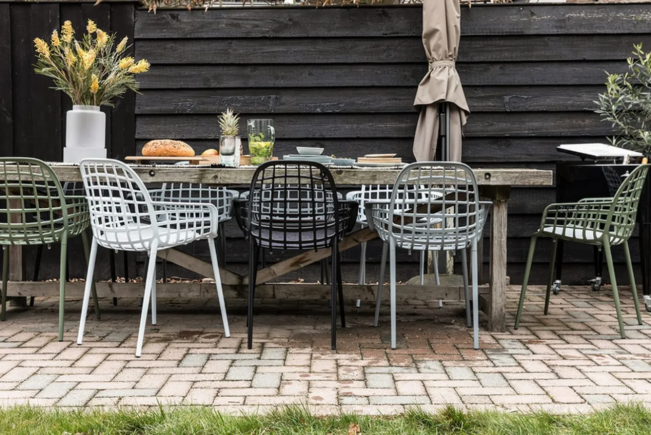 Ein Gartenstuhl, der nicht aus Holz ist, passt trotzdem gut in Ihren Outdoorbereich. Mit seiner hellgrauen Farbe finden Sie den Armlehnstuhl auch zwischen den grünsten und größten Pflanzen wieder. Das Produkt ist aus pulverbeschichtetem Aluminium. Es hat eine Höhe von 82,5cm sowie eine Breite und Tiefe von je 59,5cm. Wenn Sie allerdings keinen Garten oder keine Terrasse besitzen, können Sie den Armlehnstuhl auch in Ihrem Esszimmer verwenden. Obwohl es sich um keinen Polsterstuhl handelt, wird das Möbelstück mit dem passenden Kissen zum gemütlichen Esszimmerstuhl im Handumdrehen.