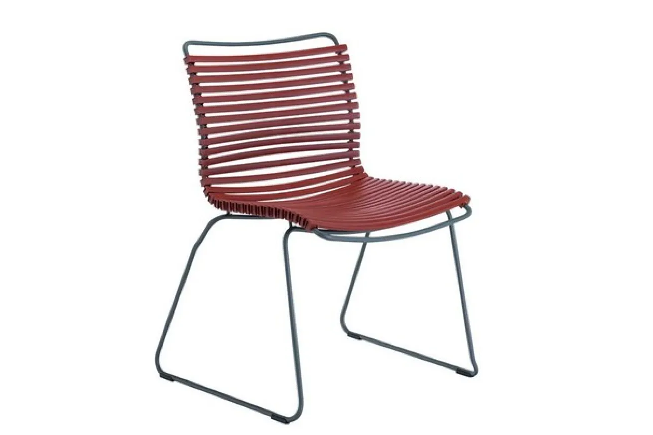 Der körpergerecht ausgeklügelte Gartenstuhl „Click“ des Labels Houe fasziniert mit bunter Optik und schlanker Formensprache. Sitz sowie Lehne bestehen aus durchgehendem Kunststoff. Die einzelnen Lamellen haben genügend Abstand zueinander, so dass sie aussehen wie Rolladen-Lamellen, durch die man hindurchschauen kann. Allerdings dient diese Aufmachung hier nicht zum Stalken, sondern für das Regenwasser, das hindurchfließen kann. Befestigt auf und getragen wird das Ganze von einem grauen Metallgestell, dem zwei Beine entspringen, die trapezförmig angeordnet sind. Dadurch sieht der Stuhl nicht aus wie ein normaler Gartenstuhl, sondern hat ein besonderes Design und wird in modernen Gärten zum echten Hingucker. Sie können zudem die Stühle bei Nichtgebrauch raumsparend stapeln.